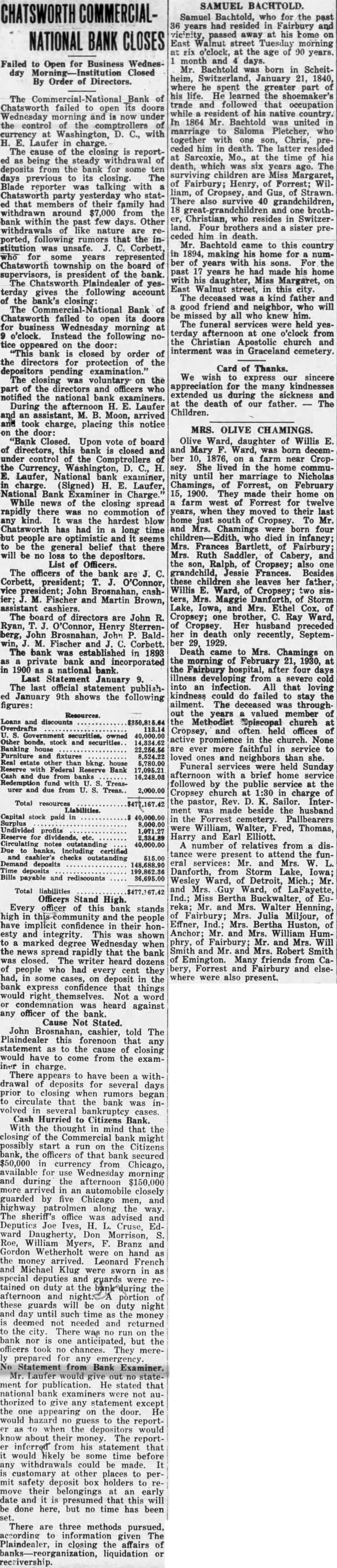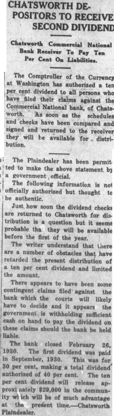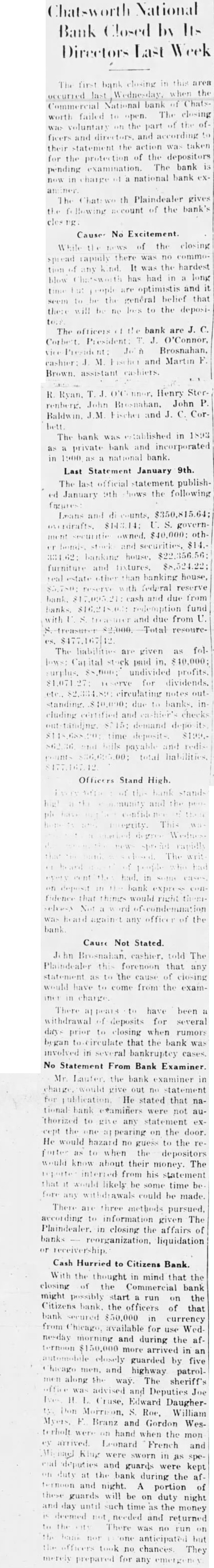 COMMERCIAL DIRECTORS Was Voluntary Protect to Bank's AcDepositors cording to Report. The Commercial National Bank, Chatsworth, failed to its open doors for business Wednesday ing at o'clock. Instead the notice appeared on the door: bank is closed by order of the directors for protection of the depositors pending examination." The closing voluntary on the part of the directors and officers who notified the national bank aminers. During the afternoon Laufer and an assistant, Moon, arrivand took charge, placing this notice on the door: Bank Closed Upon vote of board of directors, this bank closed and under control of the Comptrollers of the Currency, Washington, H. Laufer, National bank examiner, in charge. (Signed) LAUFER National Bank Examiner charge While the of the news closing spread rapidly there was no com motion of kind. any was the hardest blow Chatsworth has had in long time but people are optimistic and seems to be the general belief that there will be no loss to the depositors. List of Officers The officers of the bank are President; O'Connor, vice-president; John Brosnahan, cashier; Fischer and Martin Brown, assistant cashiers. The board of directors. are John Ryan, O'Connor, Henry Sterrenberg, John Brosnahan, John Baldwin, M. Fischer and Corbett. The bank was established in 1893 private bank and incorporated in 1900 national bank. Last Statement January 9th The last official statement publishJanuary 9th shows the following figures: Loans and discounts, overdrafts, $113.14; government securities owned, $40,000; other bonds, stocks and securities, banking house $22,256.56; furniture and fixtures, $8,real estate banking house, reserve with eral reserve bank, $17,095.21; cash and due from banks, demption fund with treasurer and due from treasurer $2,000. Total The liabilities given folas lows: Capital stock paid $40,000; surplus, $8,000; undivided profits, reserve for divi dends, etc., $2,334.89; circulating notes outstanding, due to banks. including certified and cashier's checks outstanding, $515; demand deposits, time deposits, and bills payable and rediscounts tal liabilities, Officers Stand High Every officer of this bank stands high this community and the have implicit confidence in their honesty and integrity. This shown marked degree Wednes day when the news spread rapidly that the bank was closed. The heard dozens of people who had every cent they had, in some deposit in the bank express fidence that things would right selves. Not word of hear dagainst any officer of the bank. Cause Not Stated John Brosnahan, cashier, told The Plaindealer this forenoon that any statement as to the cause of closing would have to come from the iner in charge. There appears to have been withdrawal of deposits for several days prior to closing when rumors began circulate that the bank volved in several bankruptcy cases. No Statement From Bank Examiner Mr. Laufer would give out no statement for publication. He statthat national bank examiners not authorized to give any statement except the one appearing on the door. He would hasard guess to the reporter to when the depositors would know about their money. The reporter inferred from statement that would likely some time before any withdrawals could be made. customary other places to permit safety deposit box holders to remove their belongings early date and