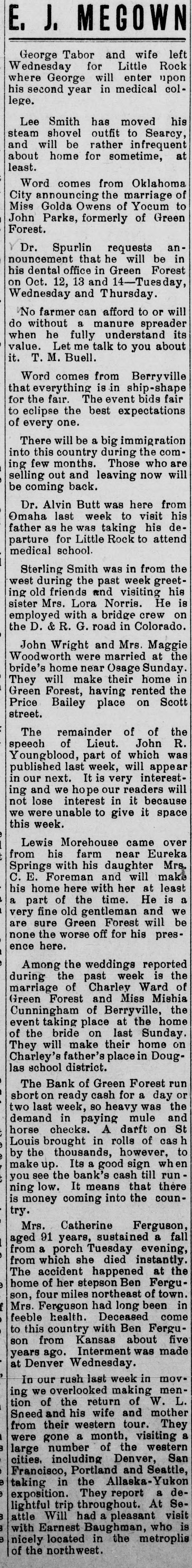 E. J. MEGOWN George Tabor and wife left Wednesday for Little Rock where George will enter upon his second year in medical college. Lee Smith has moved his steam shovel outfit to Searcy, and will be rather infrequent at about home for sometime, least. Word comes from Oklahoma City announcing the marriage of Owens of Yocum to John Miss Golda Parks, formerly of Green Forest. ) Dr. Spurlin requests announcement that he will be in his dental office in Green Forest on Oct. 12, 13 and 14-Tuesday, Wednesday and Thursday No farmer can afford to or will without a manure spreader he fully Let me talk to you value. when do understand about its it. T. M. Buell. Word comes from Berryville that everything is in ship-shape for the fair. The event bids fair to eclipse the best expectations of every one. There will be a big immigration this country during the comfew months. are ing into Those who will selling out and leaving now be coming back. Dr. Alvin Butt was here from Omaha last week to visit his father as he was taking his departure for Little Rock to attend medical school. Sterling Smith was in from the west during the past week greeting old friends and visiting his sister Mrs. Lora Norris. He is employed with a bridge crew on the D. & R. G. road in Colorado. and Mrs. Maggie were Woodworth John Wright married at the bride's home near Osage Sunday. will make their in having Green They Forest, rented home Scott the Price Bailey place on street. The remainder of of the of Lieut. part of was speech Youngblood, will which John R. last week, appear in next. It is very we ing published our and hopeour readers interest- because will not lose interest in it we were unable to give it space this week. Lewis Morehouse came over his farm near Eureka with his and Springs from C.E. Foreman daughter will make least Mrs. home here with her at of the time. a fine old we very a his part gentleman He and will is be are sure Green Forest none the worse off for his presence here. the weddings reported the past the during Among week is of Charley Ward of and of Green marriage Cunningham Forest Berryville, Miss the Mishia home the event taking place at of the bride on last Sunday. They will make their home on Charley's father's place in Douglas school district. The Bank of Green Forest run short on ready cash for a day or two last week, so heavy was the in checks. A on in Louis horse demand brought paying rolls darft mule of cas 1 and St to the thousands, Its a good the bank's you see make by up. cash however, sign till when run low. It means is ning money coming into that the coun- there try. Mrs. Catherine Ferguson, aged 91 years, sustained a fall from a porch Tuesday evening, from which she died instantly. The accident happened at the home of her stepson Ben Ferguson, four miles northeast of town. Mrs. Ferguson had long been in feeble health. Deceased come to this country with Ben Ferguson from Kansas about five years ago. Interment was made at Denver Wednesday. rush last movwe overlooked ing In our week making in men- L. tion of the return of W. Sneed and his wife and mother from their western tour. They were gone a month, visiting a large number of the western cities, including Denver, San Francisco, Portland and Seattle, taking in the Allaska-Yukon exposition. They report a delightful trip throughout. At Seattle Will had a pleasant visit with Earnest Baughman, who is nicely located in the metroplis of the northwest.