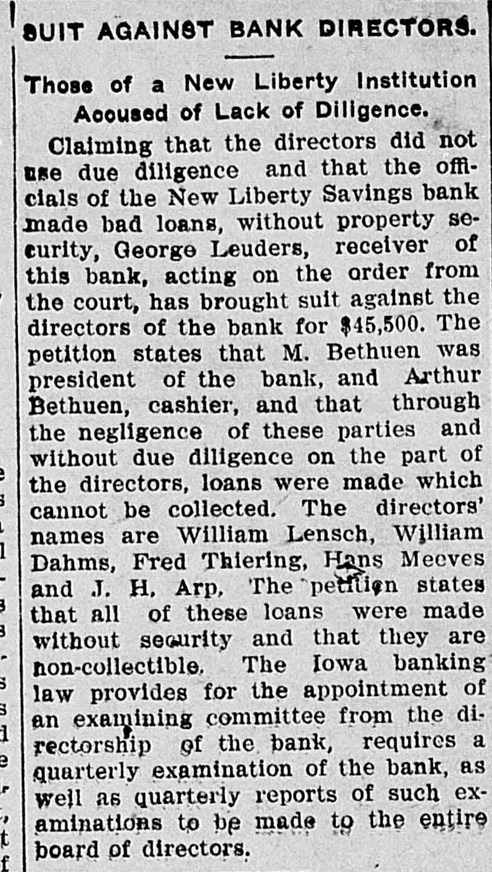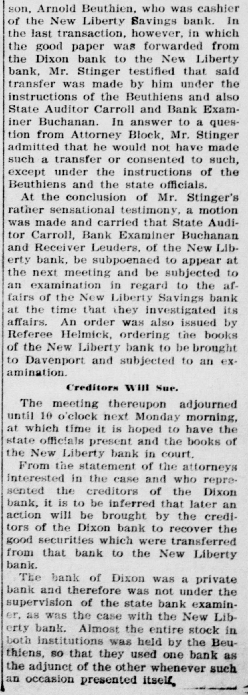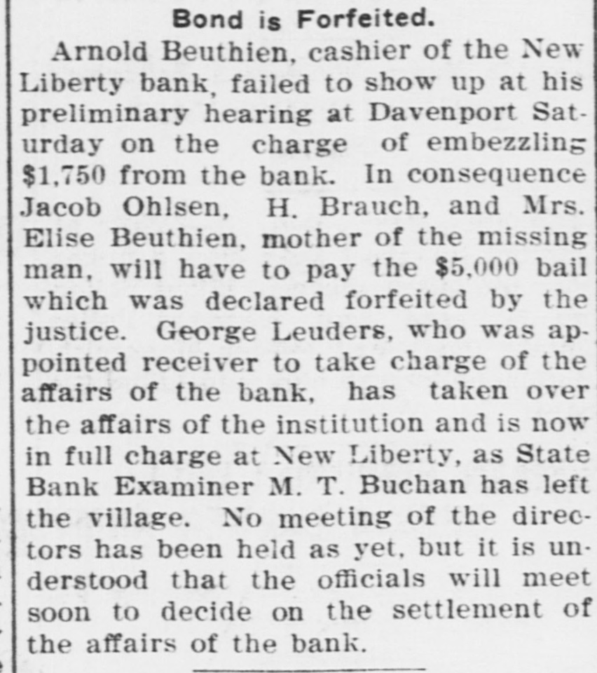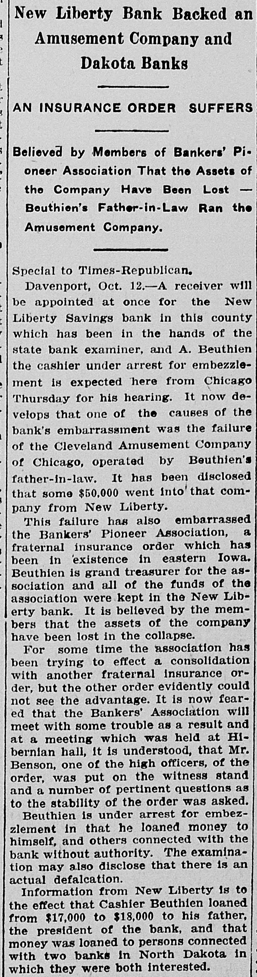New Liberty Bank Backed an Amusement Company and Dakota Banks AN INSURANCE ORDER SUFFERS Believed by Members of Bankers' Pioneer Association That the Assets of the Company Have Been Lost Beuthien's Father-in-Law Ran the Amusement Company. Special to Times-Republican. Davenport, Oct. 12.-A receiver will be appointed at once for the New Liberty Savings bank in this county which has been in the hands of the state bank examiner, and A. Beuthien the cashier under arrest for embezzlement is expected here from Chicago Thursday for his hearing. It now develops that one of the causes of the bank's embarrassment was the failure of the Cleveland Amusement Company of Chicago, operated by Beuthien's father-in-law. It has been disclosed that some $50,000 went into that company from New Liberty. This failure has also embarrassed the Bankers' Pioneer Association, a fraternal insurance order which has been in existence in eastern Iowa. Beuthien is grand treasurer for the association and all of the funds of the association were kept in the New Liberty bank. It is believed by the members that the assets of the company have been lost in the collapse. For some time the association has been trying to effect a consolidation with another fraternal insurance order, but the other order evidently could not see the advantage. It is now feared that the Bankers' Association will meet with some trouble as a result and at a meeting which was held at Hibernian hall, it is understood, that Mr. Benson, one of the high officers, of the order, was put on the witness stand and a number of pertinent questions as to the stability of the order was asked. Beuthien is under arrest for embezzlement in that he loaned money to himself, and others connected with the bank without authority. The examination may also disclose that there is an actual defalcation. Information from New Liberty is to the effect that Cashier Beuthien loaned from $17,000 to $18,000 to his father, the president of the bank, and that money was loaned to persons connected with two banks in North Dakota in which they were both interested.