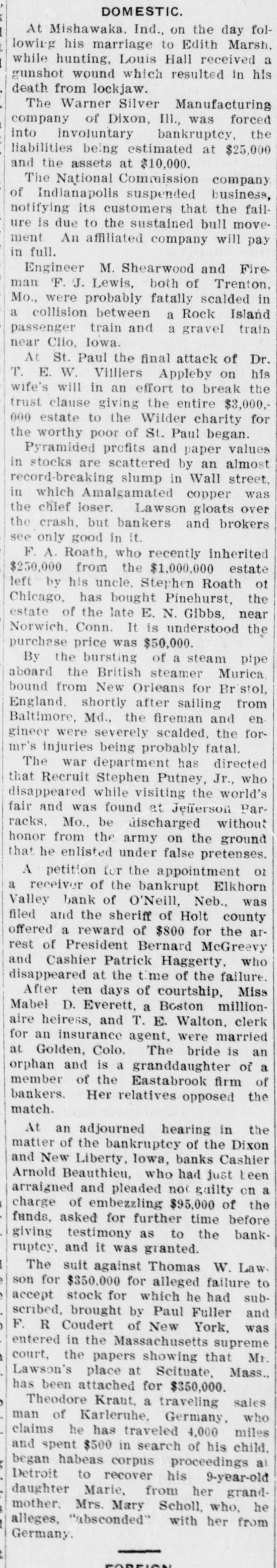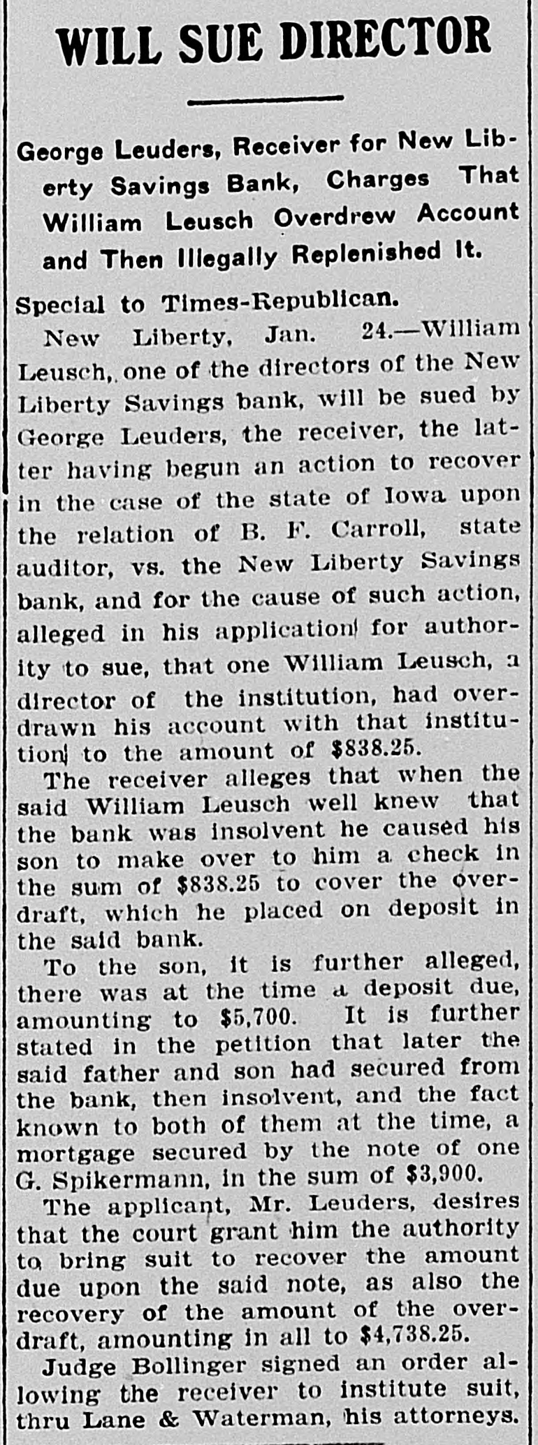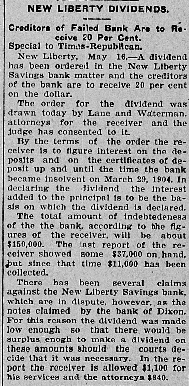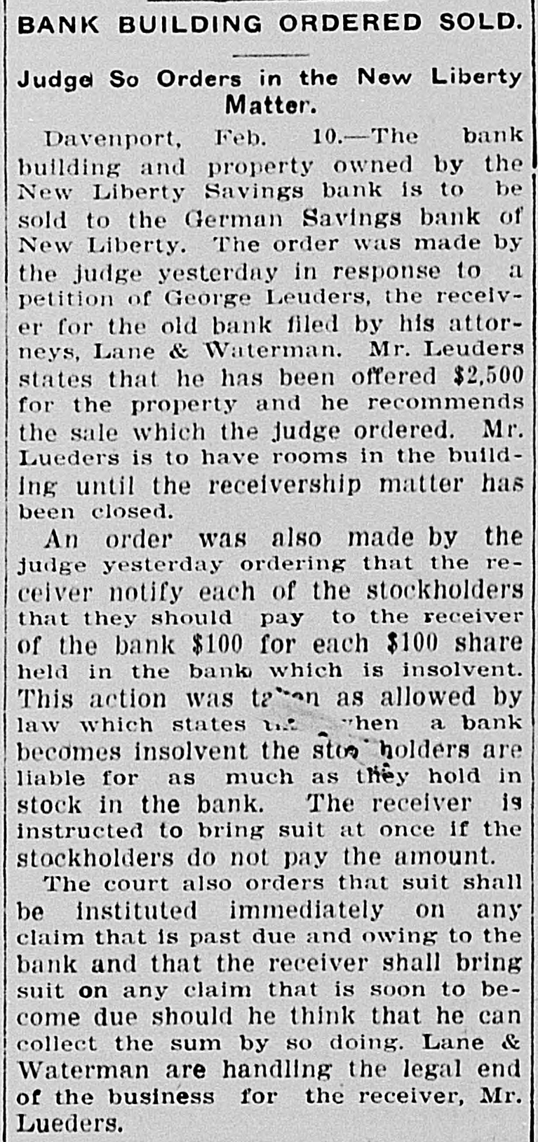New Liberty Bank Backed an Amusement Company and Dakota Banks AN INSURANCE ORDER SUFFERS Believed by Members of Bankers' Pioneer Association That the Assets of the Company Have Been Lost Beuthien's Father-in-Law Ran the Amusement Company. Special to Times-Republican. Davenport, Oct. 12.-A receiver will be appointed at once for the New Liberty Savings bank in this county which has been in the hands of the state bank examiner, and A. Beuthien the cashier under arrest for embezzlement is expected here from Chicago Thursday for his hearing. It now develops that one of the causes of the bank's embarrassment was the failure of the Cleveland Amusement Company of Chicago, operated by Beuthien's father-in-law. It has been disclosed that some $50,000 went into that company from New Liberty. This failure has also embarrassed the Bankers' Pioneer Association, a fraternal insurance order which has been in existence in eastern Iowa. Beuthien is grand treasurer for the association and all of the funds of the association were kept in the New Liberty bank. It is believed by the members that the assets of the company have been lost in the collapse. For some time the association has been trying to effect a consolidation with another fraternal insurance order, but the other order evidently could not see the advantage. It is now feared that the Bankers' Association will meet with some trouble as a result and at a meeting which was held at Hibernian hall, it is understood, that Mr. Benson, one of the high officers, of the order, was put on the witness stand and a number of pertinent questions as to the stability of the order was asked. Beuthien is under arrest for embezzlement in that he loaned money to himself, and others connected with the bank without authority. The examination may also disclose that there is an actual defalcation. Information from New Liberty is to the effect that Cashier Beuthien loaned from $17,000 to $18,000 to his father, the president of the bank, and that money was loaned to persons connected with two banks in North Dakota in which they were both interested.