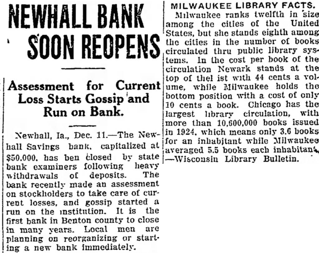 NEWHALL BANK SOON REOPENS Assessment for Current Loss Starts Gossip and Run on Bank. Newhall, Ia., Dec. 11.-The Newhall Savings bank. capitalized at $50.000. has ben closed by state bank examiners following heavy withdrawals of deposits. The bank recently made an assessment on stockholders to take care of current losses, and gossip started a run on the institution. It is the first bank in Benton county to close in many years. Local men are planning on reorganizing or starting a new bank immediately. MILWAUKEE LIBRARY FACTS. Milwaukee ranks twelfth in size among the cities of the United States, but she stands eighth among the cities in the number of books circulated thru public library systems. In the cost per book of the circulation Newark stands at the top of thel ist with 44 cents a volume, while Milwaukee holds the bottom position with a cost of only 10 cents a book. Chicago has the largest library circulation, with more than 10,600,000 books issued in 1924. which means only 3.6 books for an inhabitant while Milwaukee averaged 5.5 books each inhabitan4 -Wisconsin Library Bulletin.