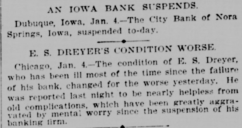 AN IOWA BANK SUSPENDS. Dubuque, Iowa, Jan. 4.-The City Bank of Nora Springs, Iowa, suspended to-day. E. S. DREYER'S CONDITION WORSE. Chicago, Jan. 4.-The condition of E. S. Dreyer, who has been ill most of the time since the failure of his bank. changed for the worse yesterday. He was reported last night to be nearly helpless from old complications, which have been greatly aggravated by mental worry since the suspension of his banking firm.