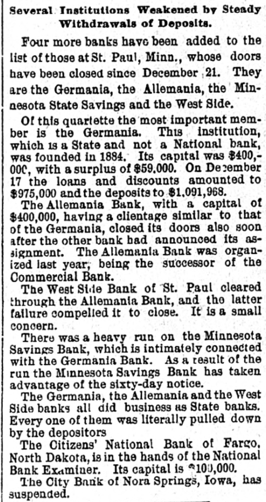 Several Institutions Weakened by Steady Withdrawals of Deposits. Four more banks have been added to the list of those at St. Paul, Minn., whose doors have been closed since December 21. They are the Germania, the Allemania, the Minnesota State Savings and the West Side. Of this quartette the most important member is the Germania. This institution, which is a State and not a National bank, was founded in 1884. Its capital was $400,000, with a surplus of $59,000. On December 17 the loans and discounts amounted to $975,000 and the deposits to $1,091,968. The Allemania Bank, with a capital of $400,000, having a clientage similar to that of the Germania, closed its doors also soon after the other bank had announced its assignment. The Allemania Bank was organized last year, being the successor of the Commercial Bank. The West Side Bank of St. Paul cleared through the Allemania Bank, and the latter failure compelled it to close. It is a small concern. There was a heavy run on the Minnesota Savings Bank, which is intimately connected with the Germania Bank. As a result of the run the Minnesota Savings Bank has taken advantage of the sixty-day notice. The Germania, the Allemania and the West Side banks all did business as State banks. Every one of them was literally pulled down by the depositors The Citizens' National Bank of Fargo, North Dakota, is in the hands of the National Bank Examiner. Its capital is $100,000. The City Bank of Nora Springs, Iowa, has suspended.