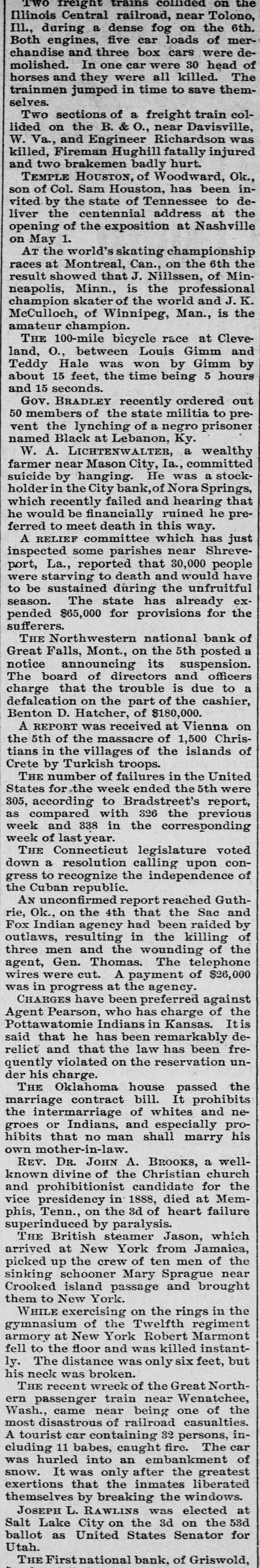 TWO freight trains collided on the Illinois Central railroad, near Tolono, Ill., during a dense fog on the 6th. Both engines, five car loads of merchandise and three box cars were demolished. In one car were 30 head of horses and they were all killed. The trainmen jumped in time to save themselves. Two sections of a freight train collided on the B. & O., near Davisville, W. Va., and Engineer Richardson was killed, Fireman Hughill fatally injured and two brakemen badly hurt. TEMPLE HOUSTON, of Woodward, Ok., son of Col. Sam Houston, has been invited by the state of Tennessee to deliver the centennial address at the opening of the exposition at Nashville on May 1. AT the world's skating championship races at Montreal, Can., on the 6th the result showed that J. Nillssen, of Minneapolis, Minn., is the professional champion skater of the world and J. K. McCulloch, of Winnipeg, Man., is the amateur champion. THE 100-mile bicycle race at Cleveland, O., between Louis Gimm and Teddy Hale was won by Gimm by about 15 feet, the time being 5 hours and 15 seconds. Gov. BRADLEY recently ordered out 50 members of the state militia to prevent the lynching of a negro prisoner named Black at Lebanon, Ky. W. A. LICHTENWALTER, a wealthy farmer near Mason City, Ia., committed suicide by hanging. He was a stockholder in the City bank, of Nora Springs, which recently failed and hearing that he would be financially ruined he preferred to meet death in this way. A RELIEF committee which has just inspected some parishes near Shreveport, La., reported that 30,000 people were starving to death and would have to be sustained during the unfruitful season. The state has already expended $65,000 for provisions for the sufferers. THE Northwestern national bank of Great Falls, Mont., on the 5th posted a notice announcing its suspension. The board of directors and officers charge that the trouble is due to a defalcation on the part of the cashier, Benton D. Hatcher, of $180,000. A REPORT was received at Vienna on the 5th of the massacre of 1,500 Christians in the villages of the islands of Crete by Turkish troops. THE number of failures in the United States for the week ended the 5th were 305, according to Bradstreet's report, as compared with 326 the previous week and 338 in the corresponding week of last year. THE Connecticut legislature voted down a resolution calling upon congress to recognize the independence of the Cuban republic. AN unconfirmed report reached Guthrie, Ok., on the 4th that the Sac and Fox Indian agency had been raided by outlaws, resulting in the killing of three men and the wounding of the agent, Gen. Thomas. The telephone wires were cut. A payment of $26,000 was in progress at the agency. CHARGES have been preferred against Agent Pearson, who has charge of the Pottawatomie Indians in Kansas. Itis said that he has been remarkably derelict and that the law has been frequently violated on the reservation under his charge. THE Oklahoma house passed the marriage contract bill. It prohibits the intermarriage of whites and negroes or Indians, and especially prohibits that no man shall marry his own mother-in-law. REV. DR. JOHN A. BROOKS, a wellknown divine of the Christian church and prohibitionist candidate for the vice presidency in 1888, died at Memphis, Tenn., on the 3d of heart failure superinduced by paralysis. THE British steamer Jason, which arrived at New York from Jamaica, picked up the crew of ten men of the sinking schooner Mary Sprague near Crooked island passage and brought them to New York. WHILE exercising on the rings in the gymnasium of the Twelfth regiment armory at New York Robert Marmont fell to the floor and was killed instantly. The distance was only six feet, but his neck was broken. THE recent wreck of the Great Northern passenger train near Wenatchee, Wash., came near being one of the most disastrous of railroad casualties. A tourist car containing 32 persons, including 11 babes, caught fire. The car was hurled into an embankment of snow. It was only after the greatest exertions that the inmates liberated themselves by breaking the windows. JOSEPH L. RAWLINS was elected at Salt Lake City on the 3d on the 53d ballot as United States Senator for