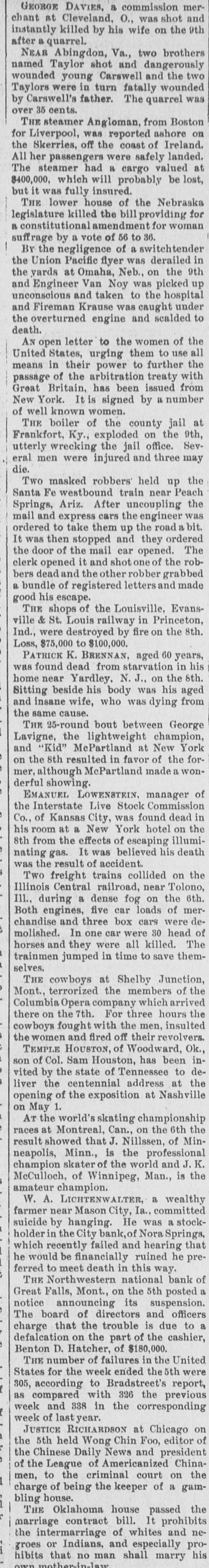 GEORGE DAVIES, a commission mer chant at Cleveland, O., was shot and instantly killed by his wife on the 9th after a quarrel. NEAR Abingdon, Va., two brothers named Taylor shot and dangerously wounded young Carswell and the two Taylors were in turn fatally wounded by Carswell's father. The quarrel was over 35 cents. THE steamer Angloman, from Boston for Liverpool, was reported ashore on the Skerries, off the coast of Ireland. All her passengers were safely landed. The steamer had a cargo valued at $400,000, which will probably be lost, but it was fully insured. THE lower house of the Nebraska legislature killed the bill providing for a constitutional amendment for woman suffrage by a vote of 56 to 36. I BY the negligence of a switchtender the Union Pacific flyer was derailed in the yards at Omaha, Neb., on the 9th and Engineer Van Noy was picked up unconscious and taken to the hospital and Fireman Krause was caught under the overturned engine and scalded to death. AN open letter to the women of the United States, urging them to use all means in their power to further the passage of the arbitration treaty with Great Britain, has been issued from New York. It is signed by a number of well known women. THE boiler of the county jail at Frankfort, Ky., exploded on the 9th, utterly wrecking the jail office. Several men were injured and three may die. Two masked robbers held up the Santa Fe westbound train near Peach Springs, Ariz. After uncoupling the mail and express cars the engineer was ordered to take them up the road a bit. It was then stopped and they ordered the door of the mail car opened. The clerk opened it and shot one of the robbers dead and the other robber grabbed a bundle of registered letters and made good his escape. THE shops of the Louisville, Evansville & St. Louis railway in Princeton, Ind., were destroyed by fire on the 8th. Loss, $75,000 to $100,000. PATRICK K. BRENNAN, aged 60 years, was found dead from starvation in his home near Yardley, N. J., on the 8th. Sitting beside his body was his aged and insane wife, who was dying from the same cause. THE 25-round bout between George Lavigne, the lightweight champion, and "Kid" McPartland at New York on the 8th resulted in favor of the for mer, although McPartland made a won derful showing. EMANUEL LOWENSTEIN. manager of the Interstate Live Stock Commission Co., of Kansas City, was found dead in his room at a New York hotel on the 8th from the effects of escaping illuminating gas. It was believed his death was the result of accident. Two freight trains collided on the Illinois Central railroad, near Tolono Ill., during a dense fog on the 6th Both engines, five car loads of mer chandise and three box cars were de molished. In one car were 30 head o: horses and they were all killed. The trainmen jumped in time to save them selves. THE cowboys at Shelby Junction Mont., terrorized the members of the Columbia Opera company which arrived there on the 7th. For three hours the cowboys fought with the men, insulted the women and fired off their revolvers TEMPLE HOUSTON, of Woodward, Ok. son of Col. Sam Houston, has been in vited by the state of Tennessee to de liver the centennial address at the opening of the exposition at Nashville on May 1. AT the world's skating championship races at Montreal, Can., on the 6th the result showed that J. Nillssen, of Min neapolis, Minn., is the professiona champion skater of the world and J. K McCulloch, of Winnipeg, Man., is the amateur champion. W. A. LICHTENWALTER, a wealthy farmer near Mason City, Ia., committed suicide by hanging. He was a stock holder in the City bank,of Nora Springs which recently failed and hearing tha he would be financially ruined he pre ferred to meet death in this way. THE Northwestern national bank o Great Falls, Mont., on the 5th posted notice announcing its suspension The board of directors and officer charge that the trouble is due to : defalcation on the part of the cashier Benton D. Hatcher, of $180,000. THE number of failures in the United States for the week ended the 5th were 305, according to Bradstreet's report as compared with 326 the previous week and 338 in the corresponding week of last year. JUSTICE RICHARDSON at Chicago or the 5th held Wong Chin Foo, editor o the Chinese Daily News and presiden of the League of Americanized China men, to the criminal court on the charge of being the keeper of a gam bling house.