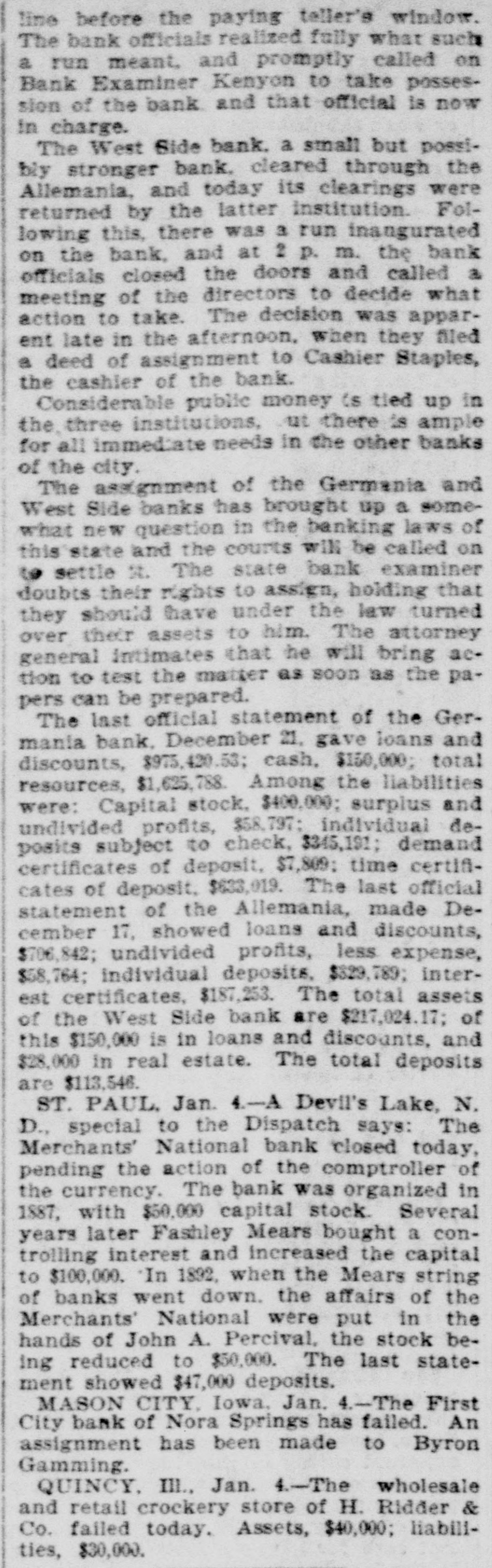 line before the paying teller's window. The bank officials realized fully what such a run meant, and promptly called on Bank Examiner Kenyon to take possession of the bank and that official is now in charge. The West Side bank. a small but possibiy stronger bank. cleared through the Allemania, and today its clearings were returned by the latter institution. Following this, there was 3 run inangurated on the bank, and at 2 p. m. the bank officials closed the doors and called a meeting of the directors to decide what action to take. The decision was apparent late in the afternoon, when they filed a deed of assignment to Cashier Staples, the cashier of the bank. Considerable public money (s tied up in the, three institutions, ut there is ample for all immediate needs in the other banks of the city. The assignment of the Germania and West Side banks has brought up a somewhat new question in the banking laws of this state and the courts will be called on to settle R. The state bank examiner doubts their rights to assign, holding that they should have under the law turned over their assets to him. The attorney general intimates that he will bring action to test the matter as soon as the papers can be prepared. The last official statement of the Germania bank. December 21, gave loans and discounts, $975,420.53; cash, $150,000; total resources, $1,625,788. Among the liabilities were: Capital stock, $400,000; surplus and undivided profits, $58,797; individual deposits subject to check, $345,191; demand certificates of deposit, $7,809: time certificates of deposit, $633,019. The last official statement of the Allemania, made December 17, showed loans and discounts, $706,842; undivided profits, less expense, $58,764; individual deposits, $329,789; interest certificates, $187,253. The total assets of the West Side bank are $217,024.17; of this $150,000 is in loans and discounts, and $28,000 in real estate. The total deposits are $113,546. ST. PAUL. Jan. 4-A Devil's Lake, N. D., special to the Dispatch says: The Merchants' National bank closed today, pending the action of the comptroller of the currency. The bank was organized in 1887, with $50,000 capital stock. Several years later Fashley Mears bought a controlling interest and increased the capital to $100,000. 'In 1892, when the Mears string of banks went down. the affairs of the Merchants' National were put in the hands of John A. Percival, the stock being reduced to $50,000. The last statement showed $47,000 deposits. MASON CITY, Iowa, Jan. 4.-The First City bank of Nora Springs has failed. An assignment has been made to Byron Gamming. QUINCY. Ill., Jan. 4.-The wholesale and retail crockery store of H. Ridder & Co. failed today. Assets, $40,000; liabilities, $30,000.