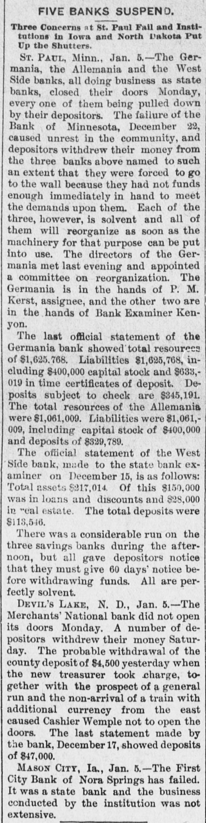 FIVE BANKS SUSPEND. Three Concerns at St. Paul Fail and Institutions in Iowa and North Dakota Put Up the Shutters. ST. PAUL, Minn., Jan. 5.-The Germania, the Allemania and the West Side banks, all doing business as state banks, closed their doors Monday, every one of them being pulled down by their depositors. The failure of the Bank of Minnesota, December 22, caused unrest in the community, and depositors withdrew their money from the three banks above named to such an extent that they were forced to go to the wall because they had not funds enough immediately in hand to meet the demands upon them. Each of the three, however, is solvent and all of them will reorganize as soon as the machinery for that purpose can be put into use. The directors of the Germania met last evening and appointed a committee on reorganization. The Germania is in the hands of P. M. Kerst, assignee, and the other two are in the hands of Bank Examiner Kenyon. The last official statement of the Germania bank showed total resources of $1,625,768. Liabilities $1,625,768, including $400,000 capital stock and $633,019 in time certificates of deposit. Deposits subject to check are $345,191. The total resources of the Allemania were $1,061,009. Liabilities were $1,061,009, including capital stock of $400,000 and deposits of $329,789. The official statement of the West Side bank, made to the state bank examiner on December 15, is as follows: Total assets $217,014. Of this $150,000 was in loans and discounts and $28,000 in real estate. The total deposits were $113,546. There was a considerable run on the three savings banks during the afternoon, but all gave depositors notice that they must give 60 days' notice before withdrawing funds. All are perfectly solvent. DEVIL'S LAKE, N. D., Jan. 5.-The Merchants' National bank did not open its doors Monday. A number of depositors withdrew their money Saturday. The probable withdrawal of the county deposit of $4,500 yesterday when the new treasurer took charge, together with the prospect of a general run and the non-arrival of a train with additional currency from the east caused Cashier Wemple not to open the doors. The last statement made by the bank, December 17, showed deposits of $47,000. MASON CITY, Ia., Jan. 5.-The First City Bank of Nora Springs has failed. It was a state bank and the business conducted by the institution was not extensive.