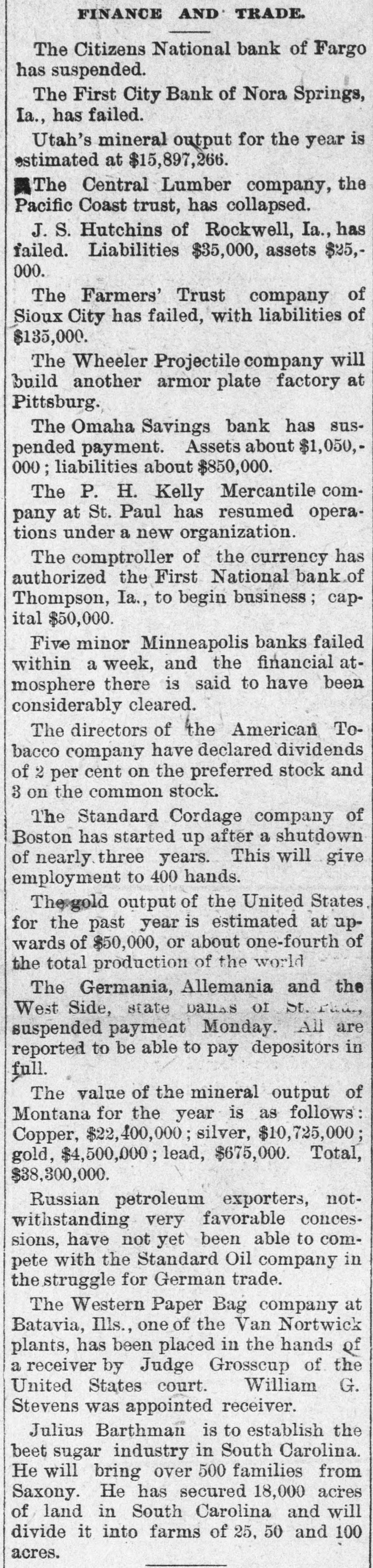 FINANCE AND TRADE. The Citizens National bank of Fargo has suspended. The First City Bank of Nora Springs, Ia., has failed. Utah's mineral output for the year is estimated at $15,897,266. The Central Lumber company, the Pacific Coast trust, has collapsed. J. S. Hutchins of Rockwell, Ia., has failed. Liabilities $35,000, assets $25,000. The Farmers' Trust company of Sioux City has failed, with liabilities of $135,000. The Wheeler Projectile company will build another armor plate factory at Pittsburg. The Omaha Savings bank has suspended payment. Assets about $1,050,000 ; liabilities about $850,000. The P. H. Kelly Mercantile company at St. Paul has resumed operations under a new organization. The comptroller of the currency has authorized the First National bank of Thompson, Ia., to begin business ; capital $50,000. Five minor Minneapolis banks failed within a week, and the financial atmosphere there is said to have been considerably cleared. The directors of the American Tobacco company have declared dividends of 2 per cent on the preferred stock and 3 on the common stock. The Standard Cordage company of Boston has started up after a shutdown of nearly three years. This will give employment to 400 hands. The gold output of the United States for the past year is estimated at upwards of $50,000, or about one-fourth of the total production of the world The Germania, Allemania and the West Side, state Danas of St. thing suspended payment Monday. All are reported to be able to pay depositors in full. The value of the mineral output of Montana for the year is as follows Copper, $22,400,000 ; silver, $10,725,000 gold, $4,500,000 ; lead, $675,000. Total, $38,300,000. Russian petroleum exporters, notwithstanding very favorable concessions, have not yet been able to compete with the Standard Oil company in the struggle for German trade. The Western Paper Bag company at Batavia, Ills., one of the Van Nortwick plants, has been placed in the hands of a receiver by Judge Grosscup of the United States court. William G. Stevens was appointed receiver. Julius Barthman is to establish the beet sugar industry in South Carolina. He will bring over 500 families from Saxony. He has secured 18,000 acres of land in South Carolina and will divide it into farms of 25, 50 and 100 acres.