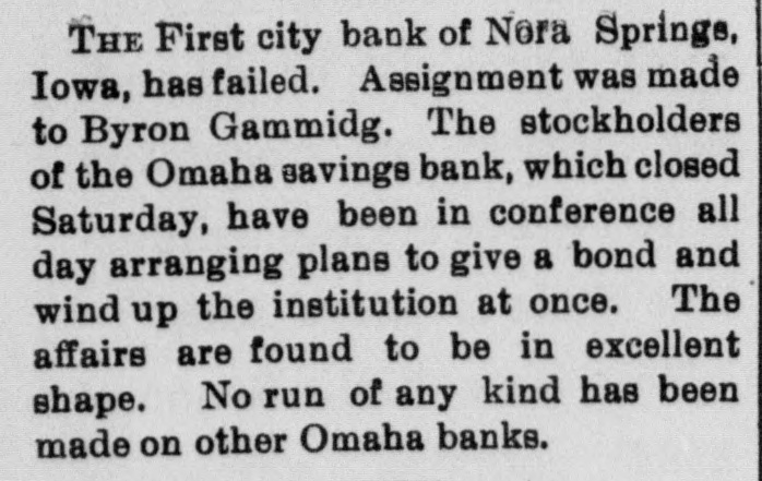 THE First city bank of Nora Springs, Iowa, has failed. Assignment was made to Byron Gammidg. The stockholders of the Omaha savings bank, which closed Saturday, have been in conference all day arranging plans to give a bond and wind up the institution at once. The affairs are found to be in excellent shape. No run of any kind has been made on other Omaha banks.