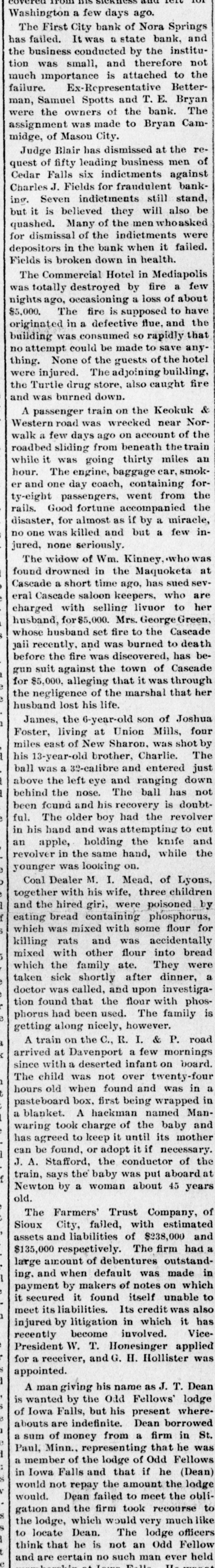 he First City bank of Nora Springs failed. It was a state bank, and business conducted by the institu1 was small, and therefore not h importance is attached to the ure. Ex-Representative Better1, Samuel Spotts and T. E. Bryan e the owners of the bank. The ignment was made to Bryan Camge, of Masou City. udge Blair has dismissed at the rest of fifty leading business men of lar Falls six indictments against rles J. Fields for fraudulent bank. Seven indictments still stand, it is believed they will also be shed. Many of the men whoasked dismissal of the indictments were ositors in the bank when it failed. ds is broken down in health. he Commercial Hotel in Mediapolis : totally destroyed by fire a few hts ago, occasioning a loss of about 00. The fire is supposed to have inated in a defective flue, and the ding was consumed so rapidly that attempt could be made to save anyag. None of the guests of the hotel e injured. The adjoining building, Turtle drug store, also caught fire I was burned down. passenger train on the Keokuk & stern road was wrecked near Nork a few days ago on account of the dbed sliding from beneath the train ile it was going thirty miles an ir. The engine, baggage car, smokand one day coach, containing foreight passengers, went from the Is. Good fortune accompanied the aster, for almost as if by a miracle, one was killed and but a few ined, none seriously. The widow of Wm. Kinney, who was nd drowned in the Maquoketa at cade a short time ago, has sued sev1 Cascade saloon keepers, who are arged with selling livuor to her sband, for $5,000. Mrs. George Green, ose husband set fire to the Cascade recently, and was burned to death ore the fire was discovered, has be0 suit against the town of Cascade $5,000. alleging that it was through negligence of the marshal that her sband lost his life. ames, the 6-year-old son of Joshua ster, living at Union Mills, four les east of New Sharon. was shot by 13-year-old brother, Charlie. The 11 was a 32-calibre and entered just ove the left eye and ranging down ind the nose. The ball has not n found and his recovery is doubtThe older boy had the revolver his hand and was attempting to cut apple, holding the knife and olver in the same hand, while the inger was looking on. oal Dealer M. I. Mead, of Lyons, ether with his wife, three children 1 the hired giri, were poisoned by ing bread containing phosphorus, ich was mixed with some flour for ling rats and was accidentally ked with other flour into bread ich the family ate. They were en sick shortly after dinner, a tor was called, and upon investigan found that the flour with phosbrus had been used. The family is ting along nicely, however. , e ce ars ived train old child at with a on was when the C., not deserted Davenport R. found a I. over and infant few & on P. was in road board. mornings a twenty-four teboard box, first being wrapped in lanket. A hackman named Manring took charge of the baby and $ agreed to keep it until its mother
