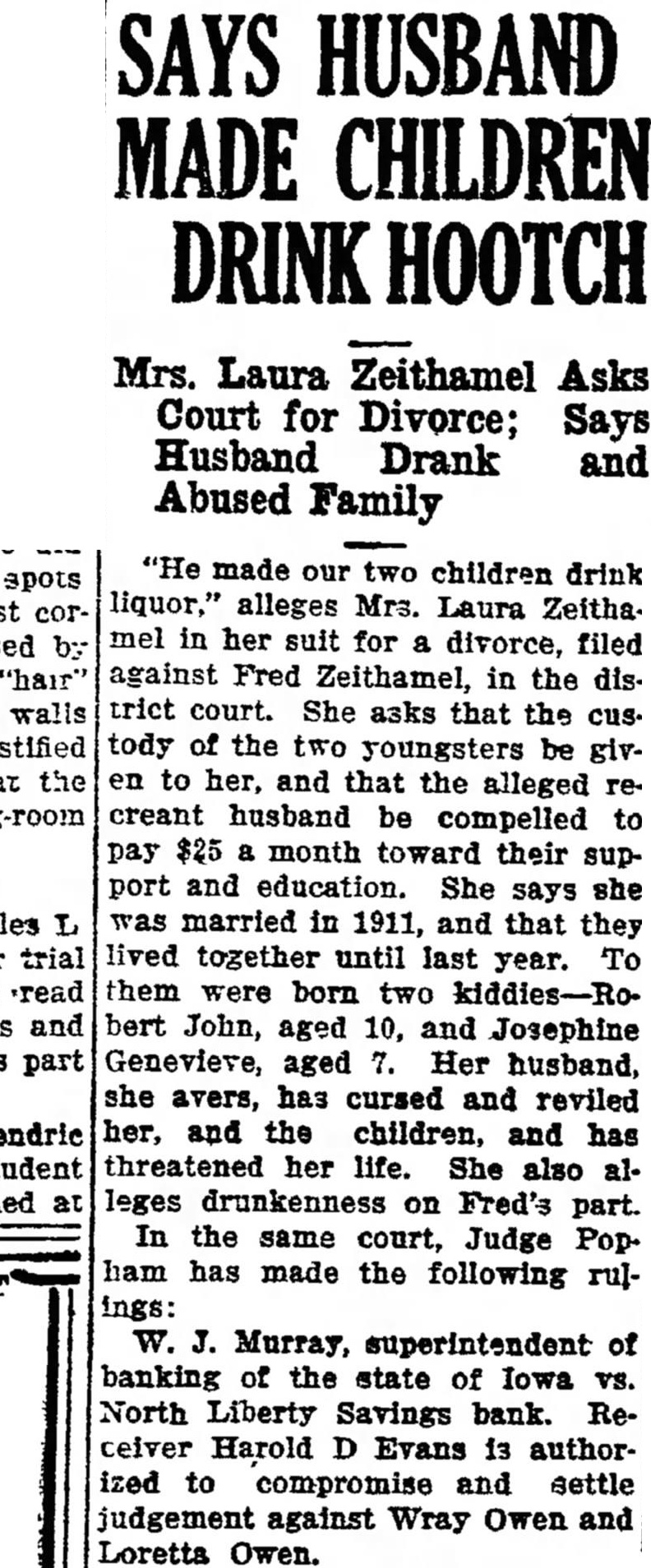 SAYS HUSBAND MADE CHILDREN DRINK HOOTCH Mrs. Laura Zeithamel Asks Court for Divorce; Says Husband Drank and Abused Family "He made our two children drink liquor," alleges Mrs. Laura Zeithamel in her suit for a divorce, filed against Fred Zeithamel, in the district court. She asks that the cus. tody of the two youngsters be given to her, and that the alleged recreant husband be compelled to pay $25 a month toward their support and education. She says she was married in 1911, and that they lived together until last year. To them were born two kiddies-Robert John, aged 10, and Josephine Genevieve, aged 7. Her husband. she avers, has cursed and reviled her, and the children, and has threatened her life. She also alleges drunkenness on Fred's part. In the same court, Judge Pop. ham has made the following rulings: W. J. Murray, superintendent of banking of the state of Iowa vs. North Liberty Savings bank. Receiver Harold D Evans 13 authorized to compromise and settle judgement against Wray Owen and Loretta Owen.