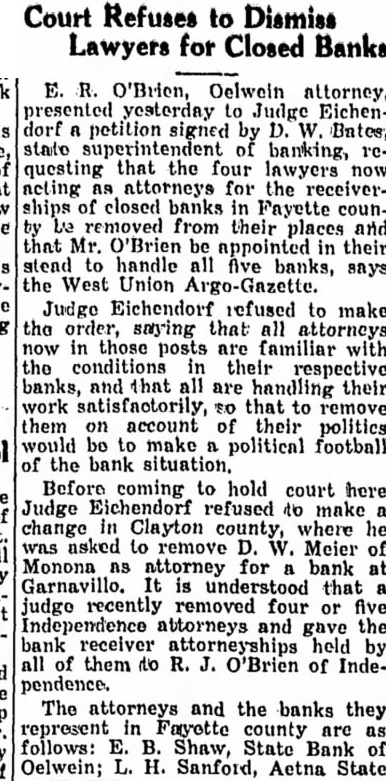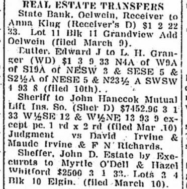 Wichman, Joseph wf. to John B. Gallagher, Recv. Chi. Joint Stock Land Bank (QCD) date of NE 10 (filed Mar. Balk, Philip to Schlichte (WD) $700 3-6-33 date parcel in NWSE 95 (filed Mar. 17). Sherim to Tonn (Sher date lots block Miles Add. Oelwein Emil Zenft (filed Mar. 20). State Bank, Octwein, Receiver Jesse Alta Reid date 2-22-33 lot block Armstrong Add. Oelwein (filed Mar. to Chi. Joint Stock Land Bank (Sher D) $10,000 date SW 3.91A part SESE & NWNE 17 (filed Mar. 20). Sanerbry, Edward et al to Bess Smith (WD) $1 date 2-20-33 Und. 5-11 21 block Fayette (filed 20). Sauerbry, James et al to Bess Edna Smith (WD) $1 date 5-11 lot 21 block Fayette (filed Mar. 20). Werner. Herman W. & to Equit. Life Ins. Co. (WD) $16000 date NE strip rds. wd. side NW 22 SESE 16 (Mar. 20).