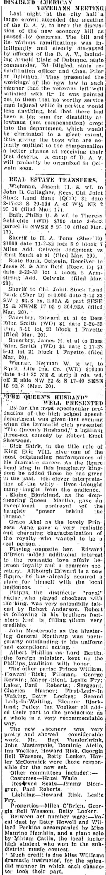 VETERANS MEETING Last night the hall city large crowd attended the meeting of the V. to hear the discussion of the new economy bill passed by congress. The bill and its various ramifications telligently and clearly discussed by officers of the V., includArnold Ulzig of Dubuque, state habilitation officer and Chas. Filer of Dubuque. They presented the workings the new law in such manner that the veterans left well satisfied with It was pointed to them that no worthy injured while in service would lose anything, but that there had been hig for disability allowance (not compensation) crept the department, which would be eliminated great extent, thus giving the boys who actually entitled to the compensation better chance at receiving their just camp of will probably be organized in Oclwein