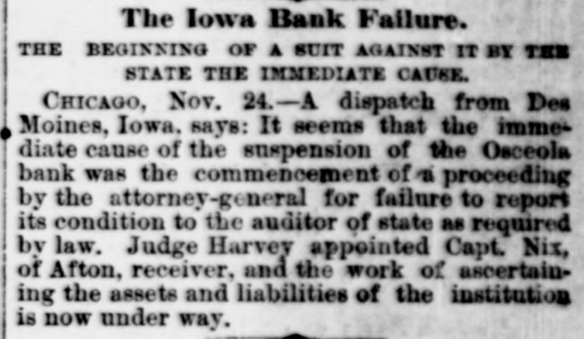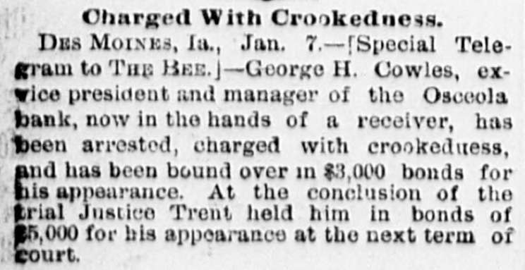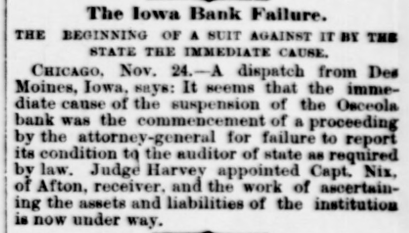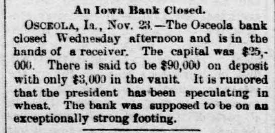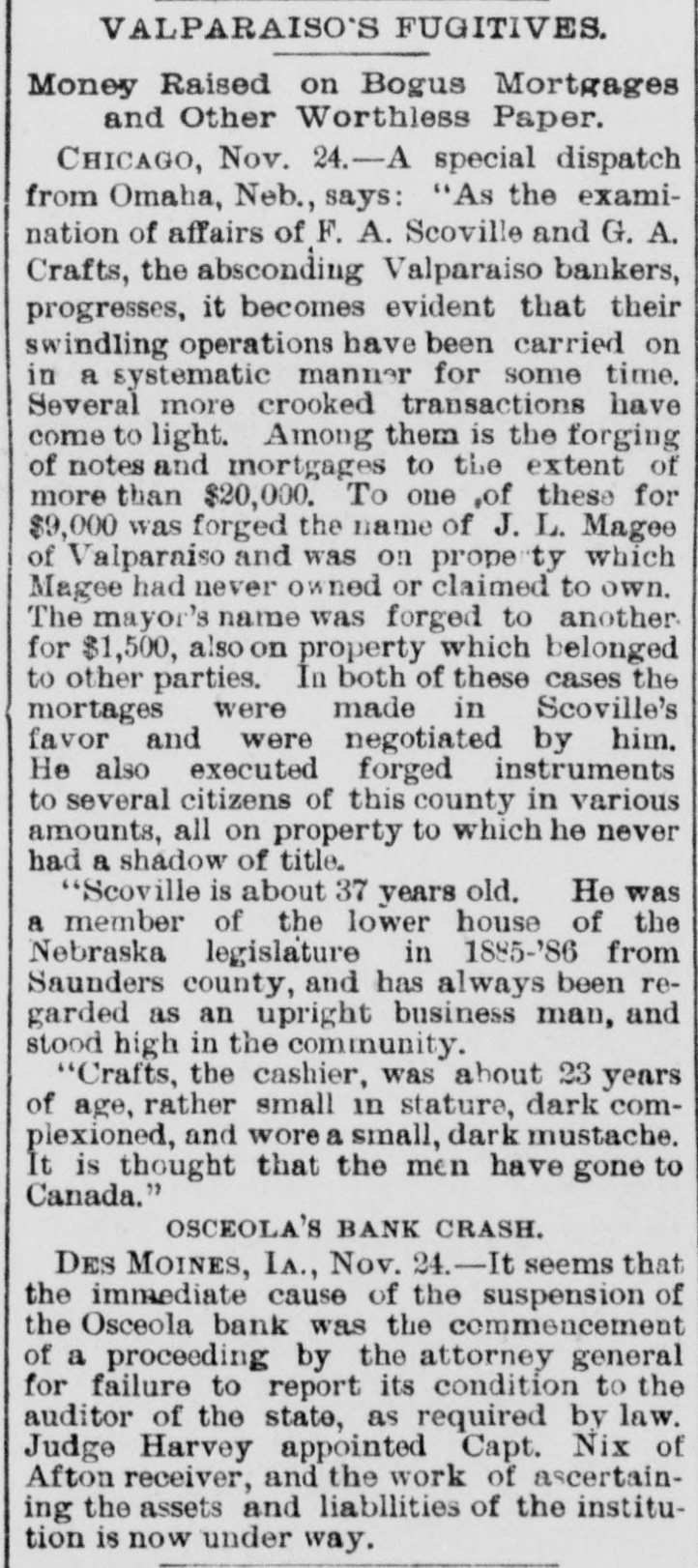 VALPARAISO'S FUGITIVES. Money Raised on Bogus Mortgages and Other Worthless Paper. CHICAGO, Nov. 24.-A special dispatch from Omaha, Neb., says: "As the examination of affairs of F. A. Scoville and G. A. Crafts, the absconding Valparaiso bankers, progresses, it becomes evident that their swindling operations have been carried on in a systematic manner for some time. Several more crooked transactions have come to light. Among them is the forging of notes and mortgages to the extent of more than $20,000. To one ,of these for $9,000 was forged the name of J. L. Magee of Valparniso and was on property which Magee had never owned or claimed to own. The mayor's name was forged to another for $1,500, also on property which belonged to other parties. In both of these cases the mortages were made in Scoville's favor and were negotiated by him. He also executed forged instruments to several citizens of this county in various amounts, all on property to which he never had a shadow of title. "Scoville is about 37 years old. He was a member of the lower house of the Nebraska legislature in 1885-'86 from Saunders county, and has always been regarded as an upright business man, and stood high in the community. "Crafts, the cashier, was about 23 years of age, rather small in stature, dark complexioned, and wore a small, dark mustache. It is thought that the men have gone to Canada." OSCEOLA'S BANK CRASH. DES MOINES, IA., Nov. 24.-It seems that the immediate cause of the suspension of the Osceola bank was the commencement of a proceeding by the attorney general for failure to report its condition to the auditor of the state, as required by law. Judge Harvey appointed Capt. Nix of Afton receiver, and the work of ascertaining the assets and liabilities of the institution is now under way.