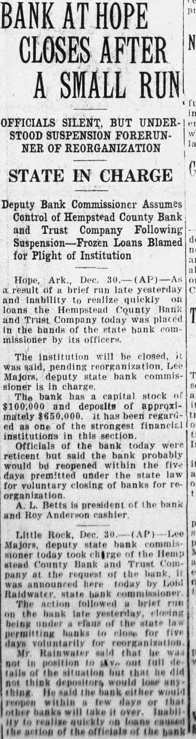 BANK AT HOPE CLOSES AFTER A SMALL RUN OFFICIALS SILENT, BUT UNDERSTOOD SUSPENSION FORERUNNER OF REORGANIZATION STATE IN CHARGE Deputy Bank Commissioner Assumes Control of Hempstead County Bank and Trust Company Following Suspension-Frozen Loans Blamed for Plight of Institution Hope, Ark. Dec. AP)-As a result of a brief run late yesterday and inability to realize quickly on loans the Hempstead County Bank and Trust Company today was placed in the of the state bank commissioner by its officers. The institution will be closed, it was said, pending ion. Lee Majors, deputy state bank commissioner is in charge. The bank capital stock of $100,000 and deposits of approximately $650,000. has been regarded as one of the strongest financial institutions in this section. Officials of the bank today were reticent but said the bank probably would be reopened within the five days premitted under the state law for voluntary closing of banks for reorganization. L. Betts is president of the bank and Roy Anderson cashier Little Rock, Dec. 30 AP Lee Majors, deputy state bank commissioner today took charge of the Hemp stead County Bank and Trust Company at the request of the bank was here today by Loid Raidwater. state bank The action followed brief run on the bank late yesterday, closing being under efaux of the state law permitting banks to close for five days voluntarily for reorganization. Mr Rainwater said that be was not in position to AVe out full de tails of the situation but that be did not think depositors would lose any thing He said the bank either would reopen within few days or that other banks will take it over. InabilBY to realize quickly on loans caused the action of the officials of the bank