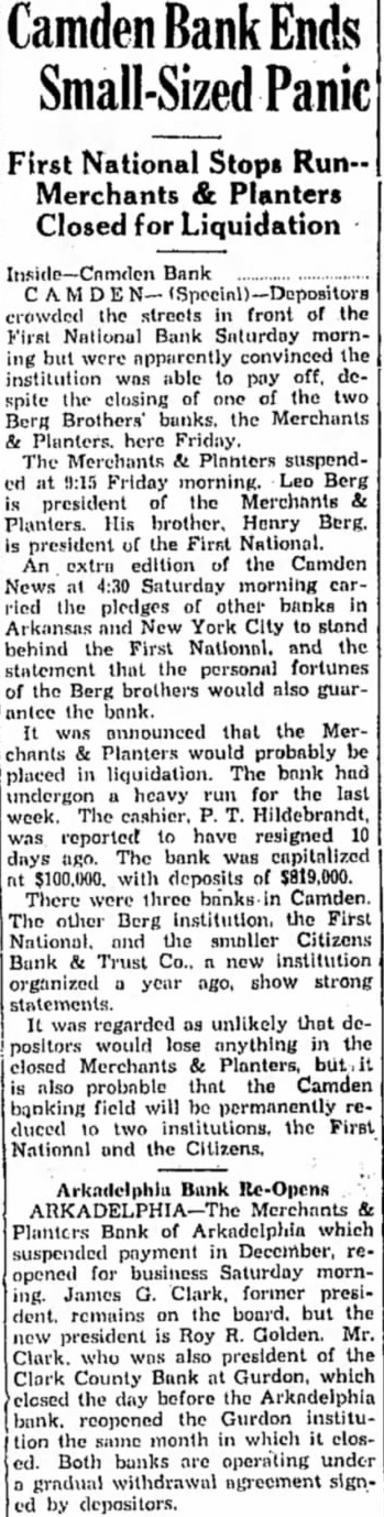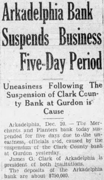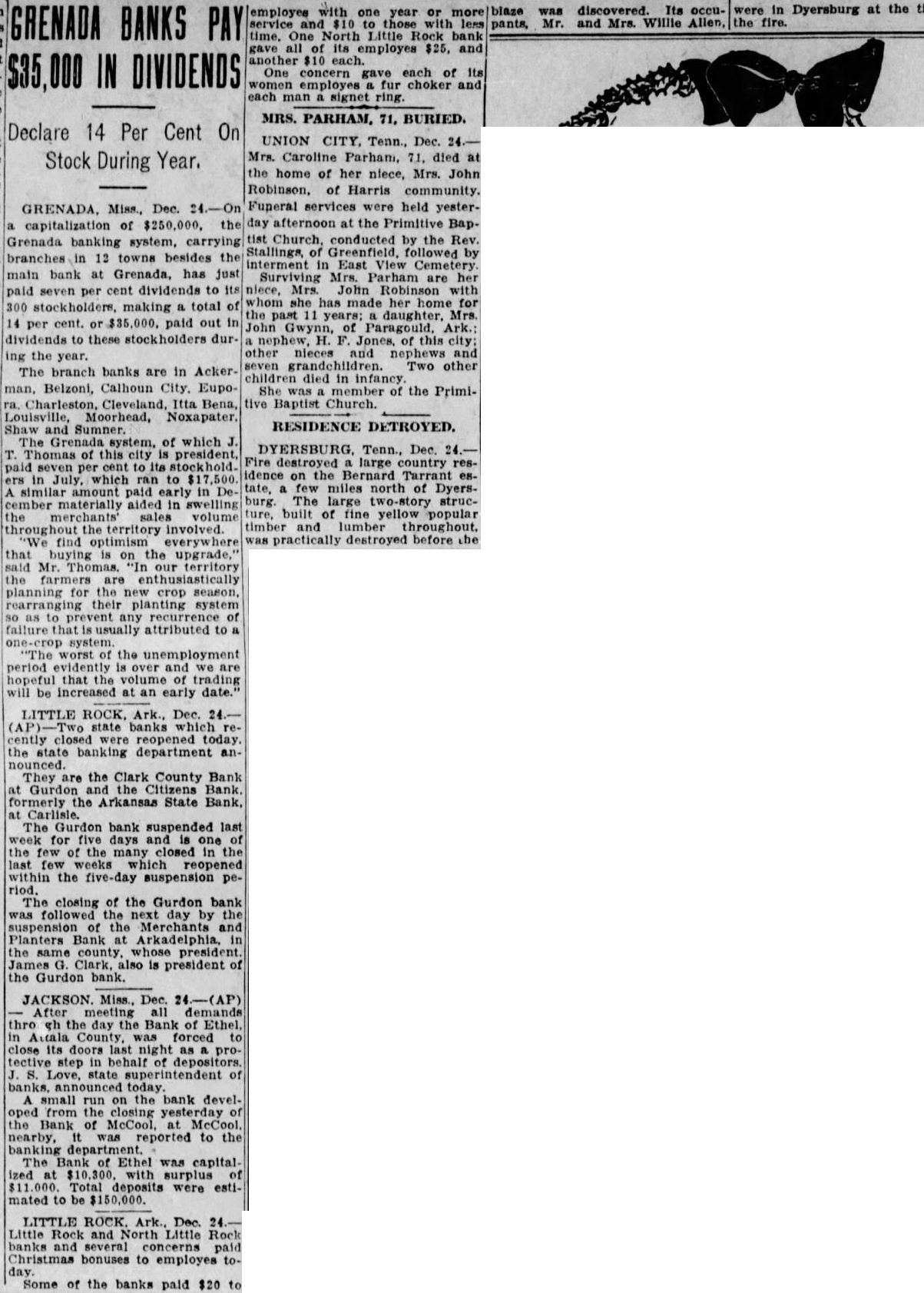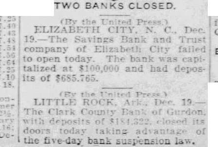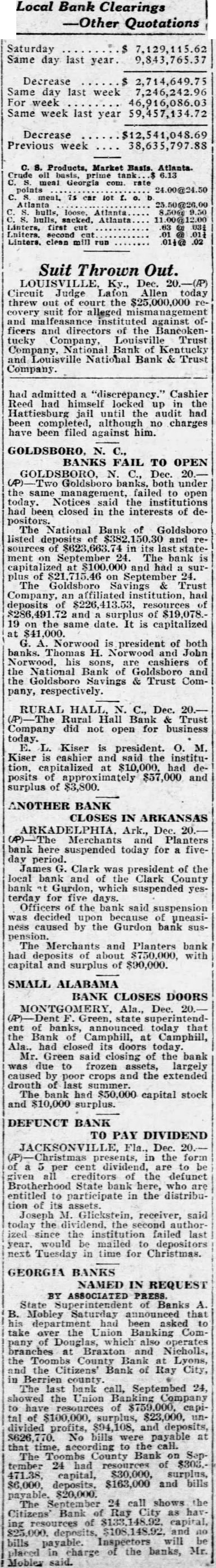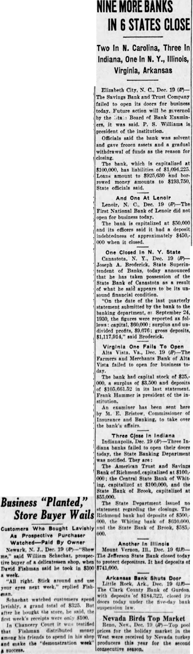 Business "Planted," Store Buyer STATES Two In N. Carolina, Three In Indiana, One In Y., Illinois, Virginia, Arkansas Elizabeth City, Dec. The Savings Bank and Trust Company failed to open its doors for business today. Future action will be governed the Board Bank Examinwas said. Williams president of the institution. Officials said the bank was solvent and gave frozen assets and gradual withdrawal of funds as the reason for closing. The bank, which is capitalized $100,000. has liabilities of $1,094,225 Loans amount $925,630 and borrowed money amounts to $193,750, State officials said. And One At Lenoir Lenoir. N. C., Dec. 19 First National Bank of Lenoir did not open for business today. The bank capitalized at $50,000 and its officers said it had deposit indebtedness of approximately 000 when it closed. One Closed In N. Y. State Dec. 19 Joseph Broderick, State Superintendent Banks, today announced that he has taken of the State Bank of Canastota result he said appears to be its unsound condition. "On the date of the last quarterly statement submitted by the bank to the banking department, September 1930. the figures reported as folcapital, $60,000: surplus and divided profits, $9,676: gross deposits, said Broderick. Virginia One Fails To Open Alta Vista. Dec. 19 Farmers and Merchants Bank of Alta Vista failed to open for business today. The bank capital stock of 000, surplus of $3,500 and deposits $105,661.52 in its last statement. Frank Hammer president of the stitution. An examiner has been sent here Bristow, Commissioner Insurance and Banking, to take over the bank's affairs. Three Close Indiana Indianapolis, Dec. Indiana banks failed open their doors today. the State Banking Department notified. They The American Trust and Savings $100,000: the Central State Bank of Whiting, capitalized and the State Bank of Brook, capitalized $55,000. The State Department issued statement regarding the closings. The Richmond bank had deposits the Whiting bank the State Bank of Brook, 000. Customers Who Bought Lavishly As Prospective Purchaser By Owner Another In Illinois Newark, Dec. Mount Vernon, III., Dec. 19 said William Schachat, prospec- Jefferson State Bank closed today tive buyer of delicatessen shop, protect depositors. It had deposits David Fishman said he took $741,000. week. Arkansas Bank Shuts Door "All right. Stick around and Little Ark., Dec. 19 next week." replied Fish your eyes The Clark County Bank Gurdon. deposits of closed watched customers spend doors today under the five-day bank grand total of $325. But suspension law. after he bought the store, he the first week's receipts only $100. Nevada Birds Top Market Court testified Reno, Nev., Dec. Chancery Fishman distributed money prices for the holiday market the that his friends to spend his were received by Nevada turkey among make the week' producers this year for the second consecutive season.