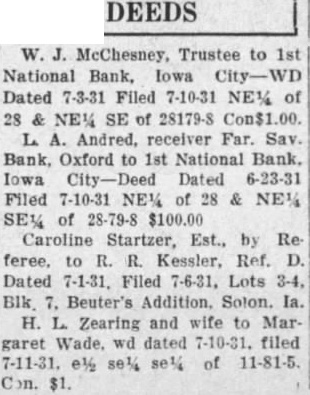 DEEDS McChesney, Trustee to 1st National Bank, Iowa Dated 7-3-31 Filed 7-10-31 NE% of 28 & NEW SE of 28179-8 L. Andred, receiver Far. Sav. Bank, Oxford to 1st National Bank. Iowa Dated 6-23-31 Filed 7-10-31 NE% of 28 & NE% SE% of 28-79-8 $100.00 Caroline Startzer, Est., by Referee. R. R. Kessler, Ref. D. Dated 7-1-31. Filed 7-6-31, Lots 3-4, Blk Beuter's Addition. Solon. Ia. H. Zearing and wife to Margaret Wade. wd dated 7-10-31. filed 7-11-31. se% of 11-81-5. Con.