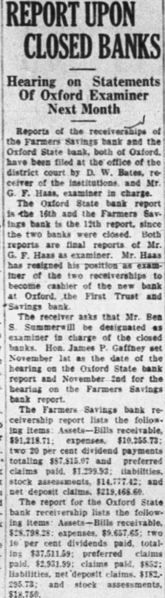 Reports of the the Farmers Savings bank and the Oxford State tank, both of Oxford. have been filed the office of the district court by D. Bates, ceiver of the and Mr. G Hass, examiner in charge. The Oxford State bank report the 16th and the Farmers Savings bank the 12th report, since the two banks were closed. Both reports are final reports of Mr. Haas examiner. Mr. Haas has resigned his position examther of the receiverships to become cashier the new bank at Oxford. the First Trust and Savings bank. The receiver asks that Mr. Ben Summerwill be designated examiner in charge of the closed banks. Hon. James Gaffney set November as the date of the hearing the Oxford State bank report and November for the hearing the Farmers Savings bank report. The Farmers Savings bank ceivership report lists the follow. ing items receivable, two 20 per cent dividend payments totaling and preferred claims paid. stock assessments, $14,777.42; and net deposit claims. The report for the Oxford State bank lists the ing expenses, two 10 per cent dividends paid, totalpreferred claims $2,931.99: claims deposit and stock assessments, $18,750.