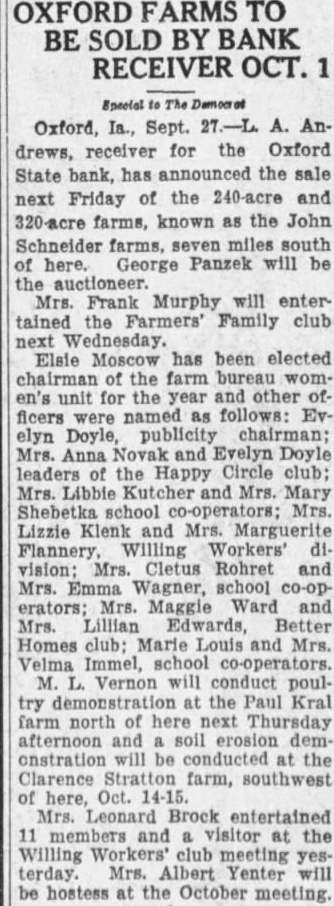 OXFORD FARMS TO BE SOLD BY BANK RECEIVER OCT. 1 Oxford, Ia., Sept. 27.-L A. Andrews, receiver for the Oxford State bank, has announced the sale next Friday of the 240-acre and 320-acre farms, known as the John Schneider farms, seven miles south of here. George Panzek will be the auctioneer. Mrs. Frank Murphy will entertained the Farmers' Family club next Wednesday. Elsie Moscow has been elected chairman of the farm bureau women's unit for the year and other officers were named as follows: Evelyn Doyle, publicity chairman; Mrs. Anna Novak and Evelyn Doyle leaders of the Happy Circle club; Mrs. Libbie Kutcher and Mrs. Mary Shebetka school co-operators; Mrs. Lizzie Klenk and Mrs. Marguerite Flannery, Willing Workers' division: Mrs. Cletus Rohret and Mrs. Emma Wagner, school co-operators; Mrs. Maggie Ward and Mrs. Lillian Edwards, Better Homes club; Marie Louis and Mrs. Velma Immel, school co-operators. M. L. Vernon will conduct poultry demonstration at the Paul Kral farm north of here next Thursday afternoon and a soil erosion demonstration will be conducted at the Clarence Stratton farm, southwest of here, Oct. 14-15. Mrs. Leonard Brock entertained 11 members and a visitor at the Willing Workers' club meeting yesterday. Mrs. Albert Yenter will be hostess at the October meeting.