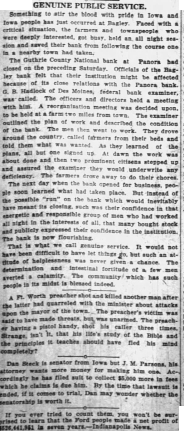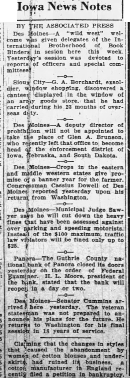 Iowa News Notes BY THE ASSOCIATED PRESS Des Moines- "wild west" welcome was given delegates of the International Brotherhood of Book Binders in sesion here this week. Yesterday's session was devoted to reports of officers and special committees Sioux City-G. A. Borchardt, exsoldier. window shopping, discovered a canteer displayed in the window of an army goods store, that he had carried during his 23 months of overseas daty. Des Moines- deputy director of prohibition will not be appointed to take the place of Glen A. Brunson, who recently left that office to become head of the enforcement district of Iowa, Nebraska, and South Dakota. Des Moines Crops in the eastern and middle western states give promise of banner year for the farmer. Congressman Cassius Dowell of Des Moines reported yesterday upon his from Washington. Des Moines Municipal Judge Sawyer says he will cut down the heavy fines that have been assessed against over parking and speeding motorists. Instead of the $100 maximum, traffic law violators will be fined only up to $25. Panora- The Guthrie County national bank of Panora closed its doors yesterday on the order of Federal Examiner. H. Moore, president of the bank, stated that the bank will reopet in a day or two. Des Moines-Senator Cummins arrived here yesterday. The veteran statesman was not prepared to announce his plans for the future. He returns to Washington for his final session in 18 years of service. Claiming that the changes in styles that caused the abandonment by women of cotton blouses and underskirts had ruined its business, cotton manufacturer in England recently filed a petition in bankruptcy.