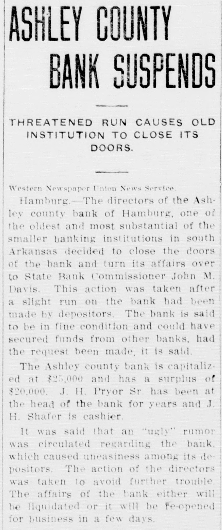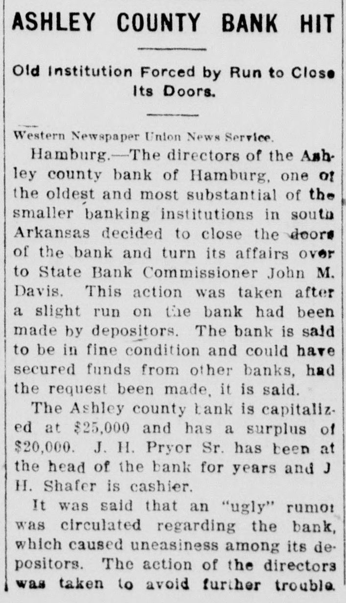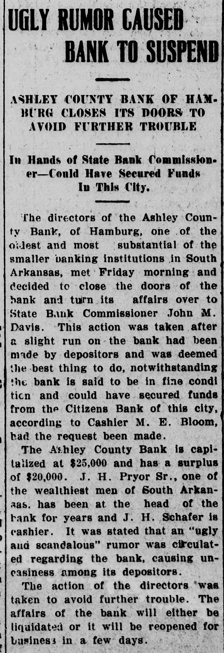 UGLY RUMOR CAUSED BANK TO SUSPEND ASHLEY COUNTY BANK OF HAMBURG CLOSES ITS DOORS TO AVOID FURTHER TROUBLE In Hands of State Bank Commission. er Could Have Secured Funds In This City. The directors of the Ashley County Bank, of Hamburg, one of the oldest and most substantial of the smaller banking institutions in South Arkansas, met Friday morning and decided to close the doors of the bank and turn its affairs over to State Bank Commissioner John M. Davis. This action was taken after as slight run on the bank had been made by depositors and was deemed the best thing to do, notwithstanding the bank is said to be in fine condi ticn and could have secured funds from the Citizens Bank of this city, according to Cashier M. E. Bloom, had the request been made. The Ashley County Bank is capitalized at $25,000 and has a surplus of $20,000. J. H. Pryor Sr., one of the wealthiest men of South Arkan3as. has been at the head of the rank for years and J. H. Schafer is cashier. It was stated that an "ugly and scandalous" rumor was circulated regarding the bank, causing uneasiness among its depositors. The action of the directors was taken to avoid further trouble. The affairs of the bank will either be liquidated or it will be reopened for business in a few days.