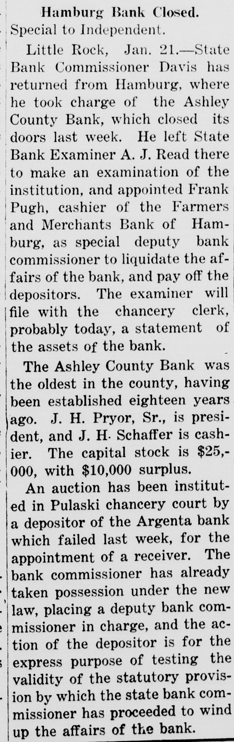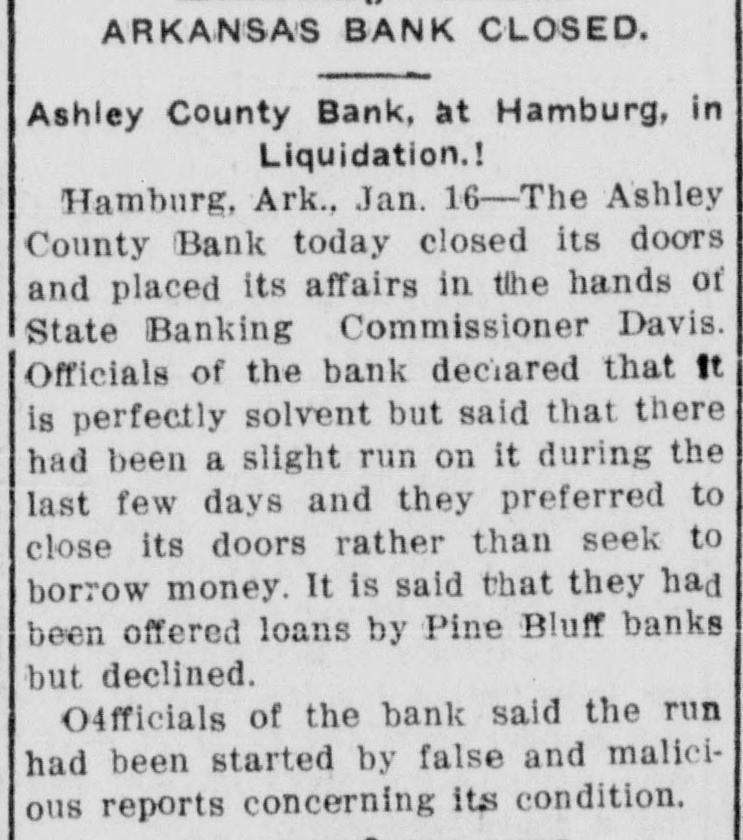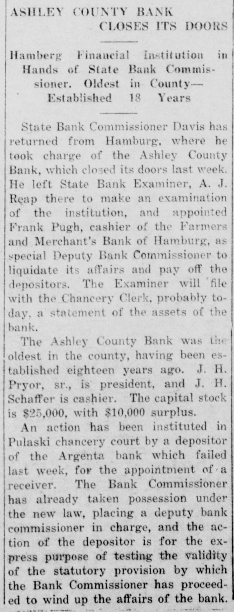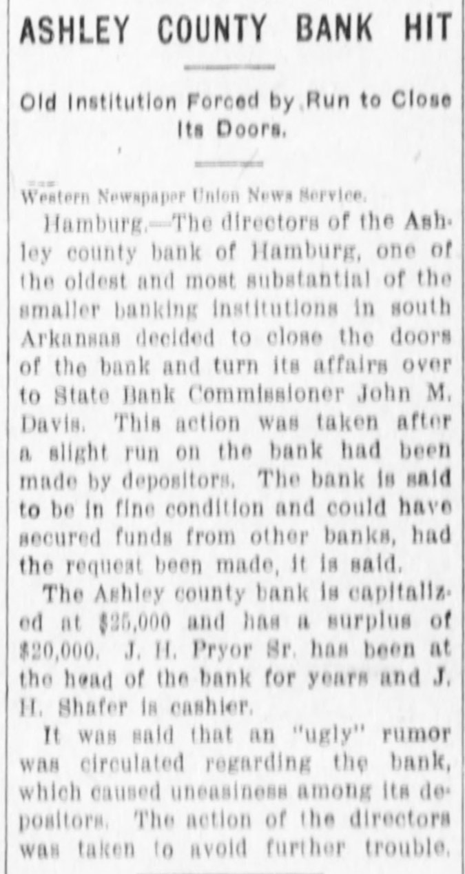 UGLY RUMOR CAUSED BANK TO SUSPEND ASHLEY COUNTY BANK OF HAMBURG CLOSES ITS DOORS TO AVOID FURTHER TROUBLE In Hands of State Bank Commission. er Could Have Secured Funds In This City. The directors of the Ashley County Bank, of Hamburg, one of the oldest and most substantial of the smaller banking institutions in South Arkansas, met Friday morning and decided to close the doors of the bank and turn its affairs over to State Bank Commissioner John M. Davis. This action was taken after as slight run on the bank had been made by depositors and was deemed the best thing to do, notwithstanding the bank is said to be in fine condi ticn and could have secured funds from the Citizens Bank of this city, according to Cashier M. E. Bloom, had the request been made. The Ashley County Bank is capitalized at $25,000 and has a surplus of $20,000. J. H. Pryor Sr., one of the wealthiest men of South Arkan3as. has been at the head of the rank for years and J. H. Schafer is cashier. It was stated that an "ugly and scandalous" rumor was circulated regarding the bank, causing uneasiness among its depositors. The action of the directors was taken to avoid further trouble. The affairs of the bank will either be liquidated or it will be reopened for business in a few days.