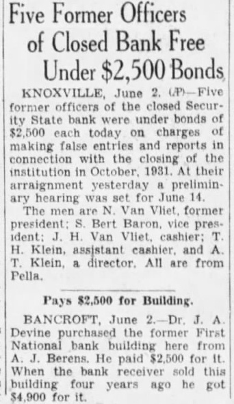 Five Former Officers of Closed Bank Free Under $2,500 Bonds KNOXVILLE June 2. former officers of the closed Security State bank were under bonds of $2,500 each today on charges of making false entries and reports in connection with the closing of the institution in October. 1931. At their arraignment yesterday a preliminary hearing was set for June 14. The men are N. Van Vliet. former president: S. Bert Baron, vice president: J. H. Van Vliet. cashier: T. H. Klein, assistant cashier. and A. T. Klein, a director. All are from Pella. Pays $2,500 for Building. BANCROFT June Dr. J. A Devine purchased the former First National bank building here from A J. Berens. He paid $2,500 for It When the bank receiver sold this building four years ago he got $4,900 for it.