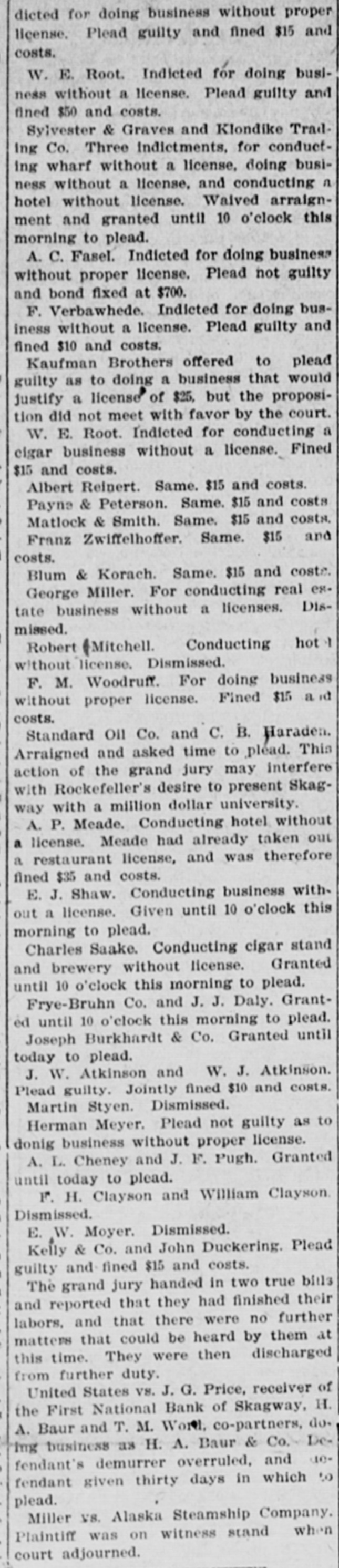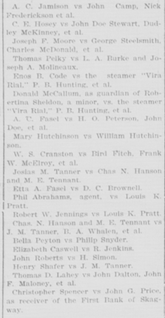 A. C. Jamison vs John Camp. Nick Frederickson et al. C. E. Hosey VS John Doe Stewart. Dudley McKinney, et al. Joseph F. Moore vs George Steelsmith Charles McDonald, et al. Thomas Pelky vs L. A. Burke and Joseph A. Molineaux Enos B. Code VS the steamer "Vira Rial." P. B. Hunting, et al. Donald McCallum as guardian of Robertina Sheldon a minor. vs. the steamer "Vira Rial," P. B. Hunting et al. A. C. Fasel vs H. O. Peterson. John Doe, et al. Mary Hutchinson vs William Hutchinson. W. S. Cranston VS Bird Fitch. Frank W. McElroy, et al. Josias M. Tanner vs Chas N. Hanson and M. E. Tennant Etta A. Fasel VS D. C. Brownell Phil Abrahams, agent. VS Louis K. Pratt. Robert W. Jennings VS Louis K. Pratt. Chas. N. Hanson and M. E. Tennant vs J. M. Tanner, B. A. Whalen, et al. Bella Peyton vs Philip Snyder. Elizabeth Caswell vs R. Jenkins. John Roberts VS H. Simon. Henry Shafer vs J. M. Tanner. Thomas D. Lahey vs John Dalton. John F. Maloney, et al. Christopher Spencer vs John G. Price. as receiver of the First Bank of Skagway.