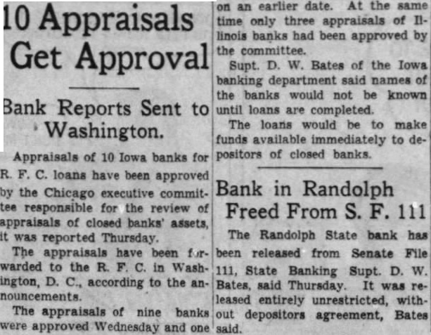 10 Get Approval Bank Reports Sent to Washington. on an earlier date. At the same time only three appraisals of IIlinois banks had been approved by the committee. Supt. D. W. Bates of the Iowa banking department said names of the banks would not be known until loans are completed. The loans would be to make funds available immediately to depositors of closed banks. Appraisals of 10 Iowa banks for R. C. loans have been approved Bank in Randolph by the Chicago executive committee responsible for the review of Freed From S. F. 111 appraisals of closed banks' assets, The Randolph State bank has it was reported Thursday. The appraisals have been been released from Senate File warded to the R. F. C. in Wash111, State Banking Supt. D. W ington, D. C., according to the anBates, said Thursday. It was renouncements. leased entirely unrestricted, withThe appraisals of nine banks out depositors agreement, Bates were approved Wednesday and one said.