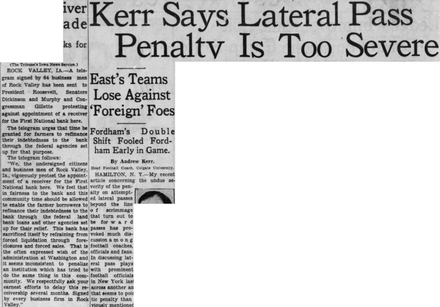 Kerr Says Lateral Pass Penaltv Is Too Severe ROCK VALLEY, signed by 64 business gram East's Rock Valley has been sent President Roosevelt, Senators Dickinson and Murphy and Congressman Gillette protesting 'Foreign' against appointment of receiver the National bank here. telegram urges that time Fordham's granted for to refinance the bank Shift through the federal agencies for that purpose. telegram follows: the undersigned citizens Head Football business men of Rock Valley, HAMILTON, protest the receiver for the First article concerning National bank here. We feel that verity the penfairness the bank and on attemptshould be allowed lateral passes the farmer borrowers beyond line refinance their indebtedness to scrimmage through the federal land that turn out and other agencies for their relief. This bank has passes has itself refraining voked much disforced through fore- cussion closures forced That football coaches, often expressed wish of the officials and fans. at and In discussing inconsistent to penalize eral pass plays institution which has tried prominent the same thing in this football officials munity. respectfully your New York last earnest efforts to delay this across another ceivership several months. Signed seems to point every business firm in penalty than viously mentioned. Teams Lose Against Double Fooled Fordham Early in Game. By Andrew Kerr. Colgate recent the undue