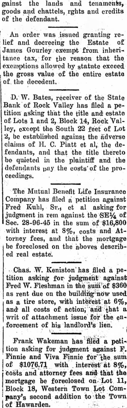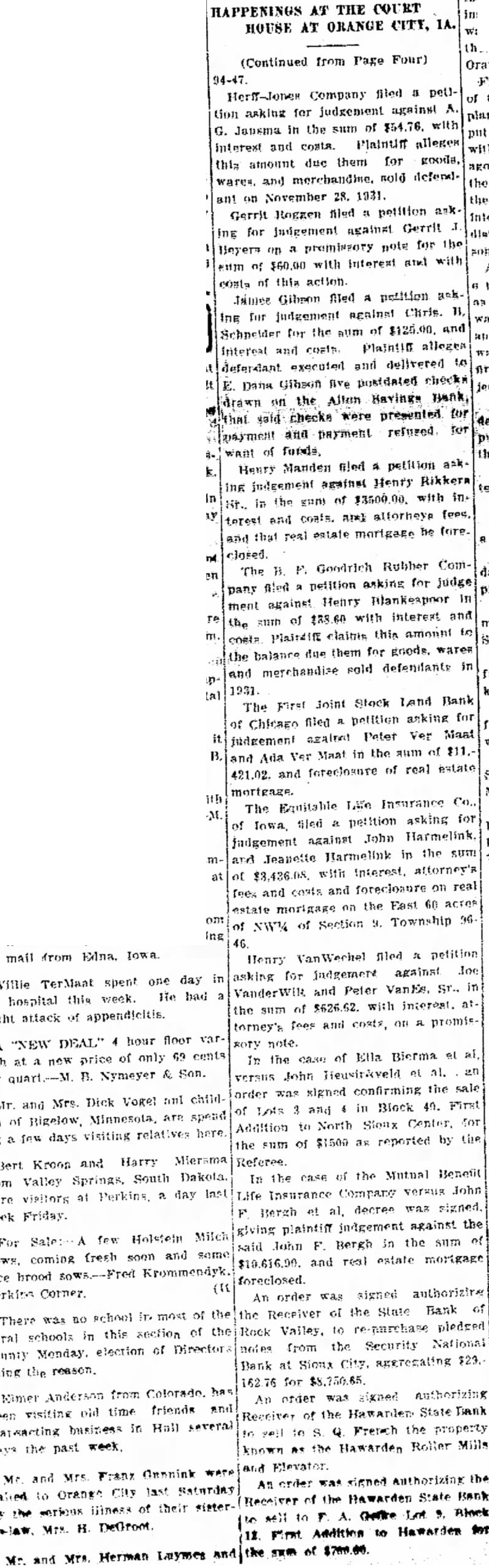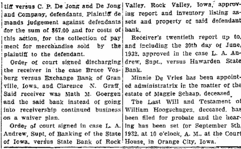 tiff versus C. P. De Jong and De Jong and Company, defendants Plaintiff de mands judgement against defendants for the sum of $67.00 and for costs of this action, for the collection of pay ment for merchandise sold by the plaintiff to the defendant. Order of court signed discharging the receiver in the case Bruce Vosburg versus Exchange Bank of Gran ville, Iowa. and Clarence N. Graff Said receiver was Math M. Goergen and the said bank instead of going into receivership continued business on a waiver plan. Order of court signed in case L A. Andrew, Supt of Banking of the State of Iowa. versus State Bank of Rock Valley. Rock Valley, Iowa, approving report and inventory listing assets and property of said defendant Receiver's twentieth report up to, and including the 30th day of June, 1932. approved in the case L. A. Andrew, Supt., versus Hawarden State Bank. Minnie De Vries has been appointed administratrix in the matter or the estate of Maggie Schaap, deceased The Last Will and Testament of William Hoogschagen. deceased. has been filed for probate and the hearing has been set for September 5th, 1932. at 10 o'clock, A. M., at the Court House, in Orange City, Iowa.