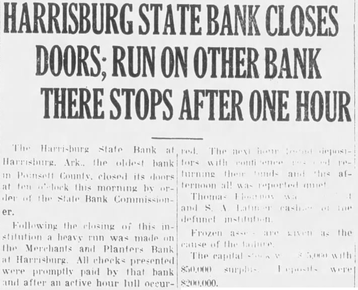 HARRISBURG STATE BANK CLOSES DOORS; RUN ON OTHER BANK THERE STOPS AFTER ONE HOUR The Harrisburg State Bank at red Harrisburg. Ark., the oldest bank in Poinsett County. closed its doors at ten d'slock this morning by orlei of the State Bank Commissioner. Following the closing of this institution a heavy run was made on the Merchants and Planters Bank at Harrisburg All checks presented were promptly paid by that bank and after an active hour full occur- The hour fors with ence ternoon all reported muet Thomas defunet institution cause of the failure The capital $50,000 were