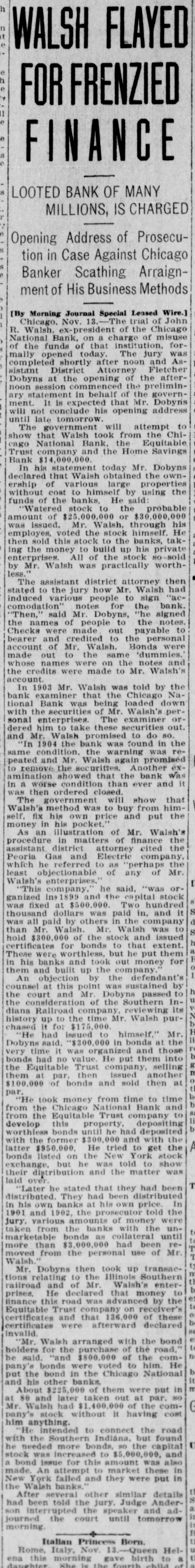 WALSH FLAYED FOR FRENZIED s FINANCE LOOTED BANK OF MANY MILLIONS, IS CHARGED Opening Address of Prosecution in Case Against Chicago Banker Scathing Arraignment of His Business Methods [By Morning Journal Special Leased Wire.] Chicago, Nov. 13.-The trial of John R Walsh ex-president of the Chicago National Bank on charge of misuse of the funds of that institution formaily opened today The jury was completed shortly after noon and Assistant District Attorney Fletcher Dobyns at the opening of the aftercommenced the preliminnoon session governary statement in behalf of the ment It is expected that Mr Dobyns will not conclude his opening address until late tomorrow The go vernment will attempt to show that Walsh took from the Chicago National Bank the Equitable Trust company and the Home Savings Bank $14,000,000. In his statement today Mr Dobyns declared that Walsh obtained the ownership of various large properties the without cost to hims by using funds of the banks He said Watered stock to the probable amount of $25,000,000 or $30 5.000.000 was issued. Mr Walsh, through his employes, voted the stock himself He then sold this stock to the banks, taking the money to build up his private enterprises. All of the stock so-sold by Mr Walsh was practically worth less The assistant district attorney then stated to the jury how Mr Walsh had induced various people to sign 'ac comodation notes for the bank 'Then,' said Mr Dobyns, "he signed the names of people to the notes Checks were made out payable to bearer and credited to the personal account of Mr Walsh. Bonds were made out to the same 'dummies names were on the notes and the whose credits were made to Mr. Walsh's account. In 1903 Mr Walsh was told by the bank examiner that the Chicago Na tional Bank was being loaded down with the securities of Mr Walsh's per sonal enterprises. The examiner or dered him to take these securities out. and Mr Walsh promised to do so In 1904 the bank was found in the same condition the warning was repeated and Mr Walsh again promised ex to remove the securities Another amination showed that the bank was in a worse condition than ever and it was then ordered closed. The government will show that Walsh's method was to buy from him self, fix his own price and put the money in his pocket As an illustration of Mr. Walsh's procedure in matters of finance the assistant district attorney cited the Peoria Gas and Electric company which he referred to as 'perhaps the least objectionable of any of Mr. Walsh's enterprises 'This company he said, "was or ganized in 1899 and the apital stock was fixed at $500,000 Two hundred it thousand dollars was paid in, and was all paid by others in the company than Mr. Walsh Mr Walsh was to hold $300 000 of the stock and issued certificates for bonds to that extent These were worthless, but he put them for in his banks and took out money them and built up the company An obje ection by the defendant's counsel at this point was sustained by the court and Mr Dobyns passed the considerati of the Southern Indiana Railroad company reviewing its history up to the time Mr Walsh pur chased for $175,000 Mr himself He had issued Dobyns said, $300,000 in bonds at the very time it was organized and those bonds had no value He put them into the Equitable Trust company selling issued another them at par then $100,000 of bonds and sold then at par. He took money from time to time from the Chicago National Bank and to from the Equitable Trust company develop this property depositing worthless bonds until he had deposited with the former $300 000 and with the latter $950.000. He tried to get the bonds listed on the New York stock exchange, but he was told to show their distribution and the matter was over laid Later he stated that they had been distributed They had been distributed In in his own banks at his own price. 1901 and 1902 the prosecutor told the jury, various amounts of money were from the banks with the unmarketable taken bonds as collateral until more than $3,000,000 had been removed from the personal use of Mr Walsh Mr Dobyns then took up transac tions relating to the Illinois Southern railroad and of Mr Walsh's enterprises. He declared that money to finance this road was advanced by the Equitable Trust company on receiver's certificates and that 136,000 of these certificates were afterward declared invalid. Mr. Walsh arranged with the bond holders for the purchase of the road, he said. and $800,000 of the com pany's bonds were voted to him. He put the bond in the Chicago National and his other banks About $225,000 of them were put in at 80 and later taken out at par. so Mr. Walsh had $1,400,000 of the company's stock without it having cost him anything. He intended to connect the road with the Southern Indiana, but found he needed more bonds, 80 the capital stock was increased to $5,000,000. and a bond issue for this amount was also made An attempt to market these in New York falled and they were put in the Walsh banks After several other similar details had been told the jury Judge Anderson interrupted the speaker and adjourned the court until tomorrow morning Italian Princess Born Rome, Italy, Nov. 13.- Queen Helena this morning gave birth to is the fourth child