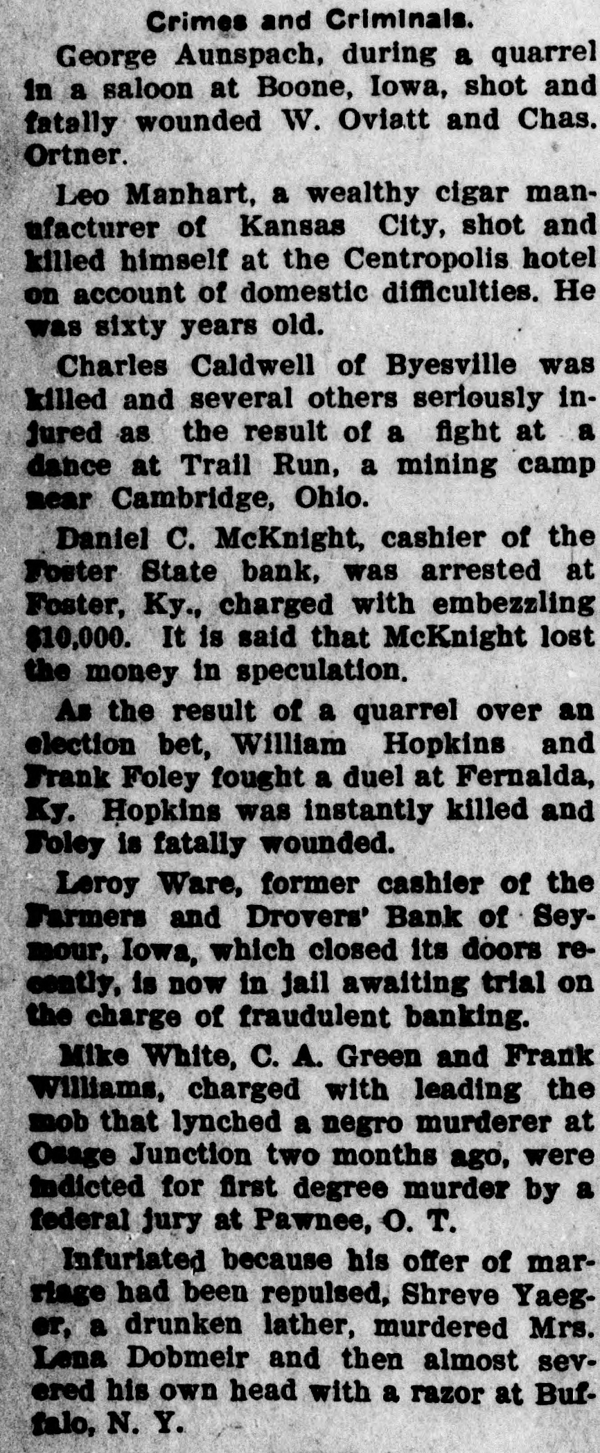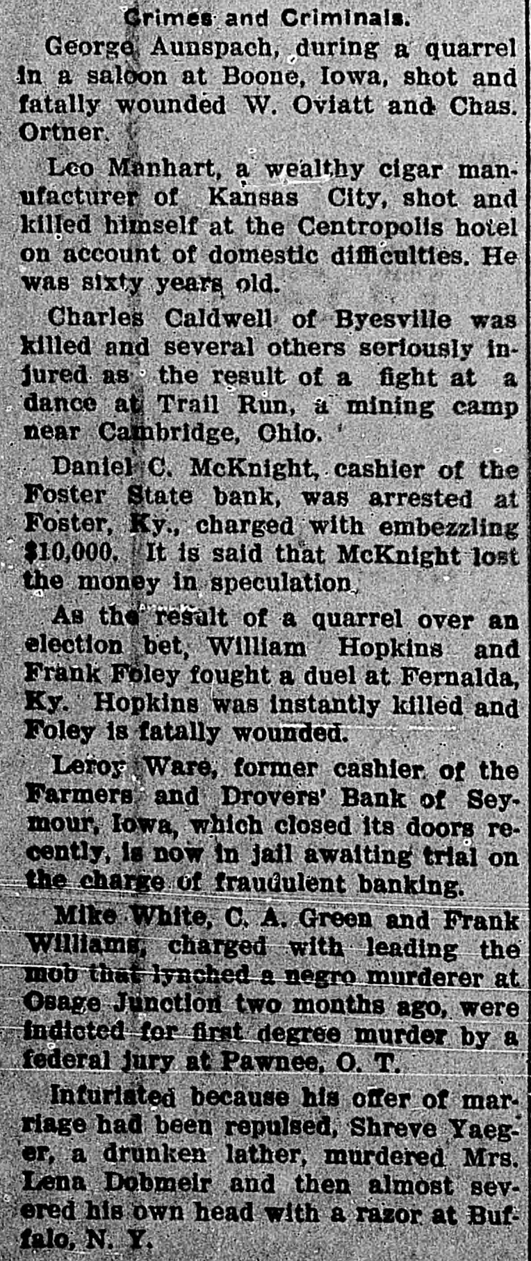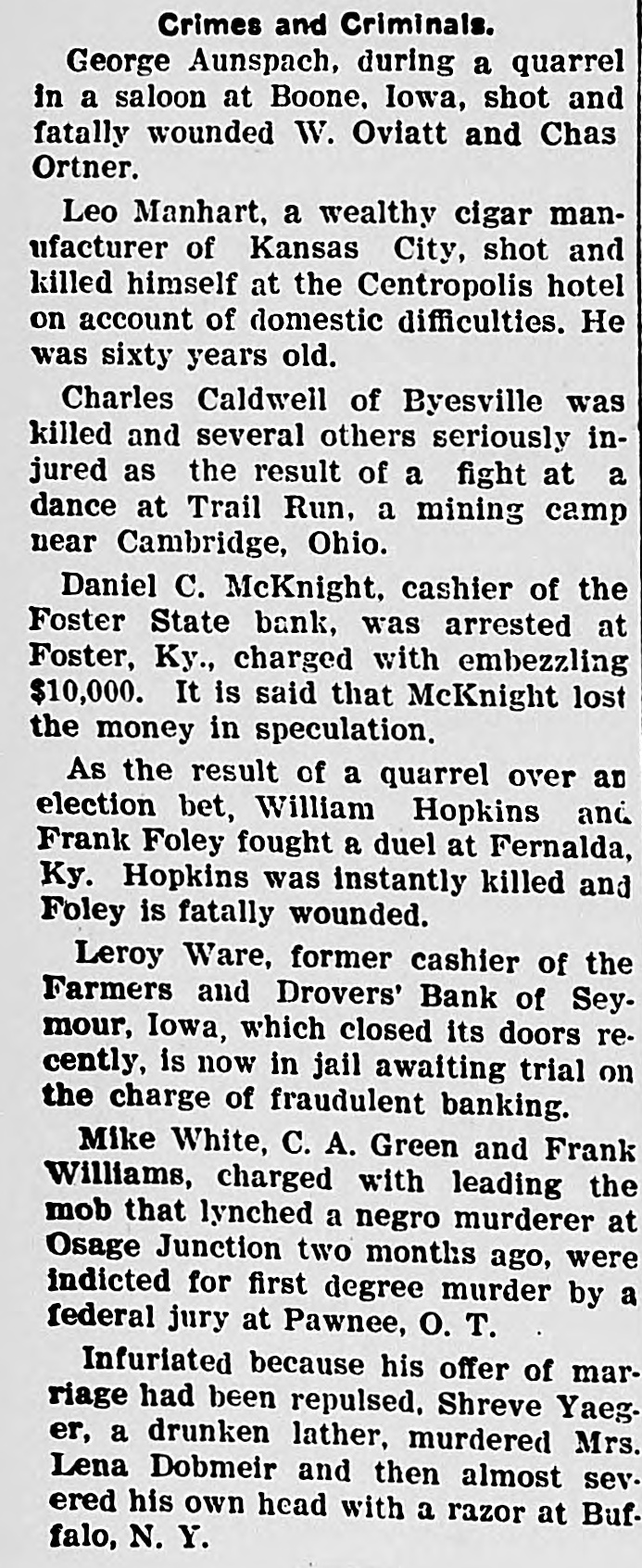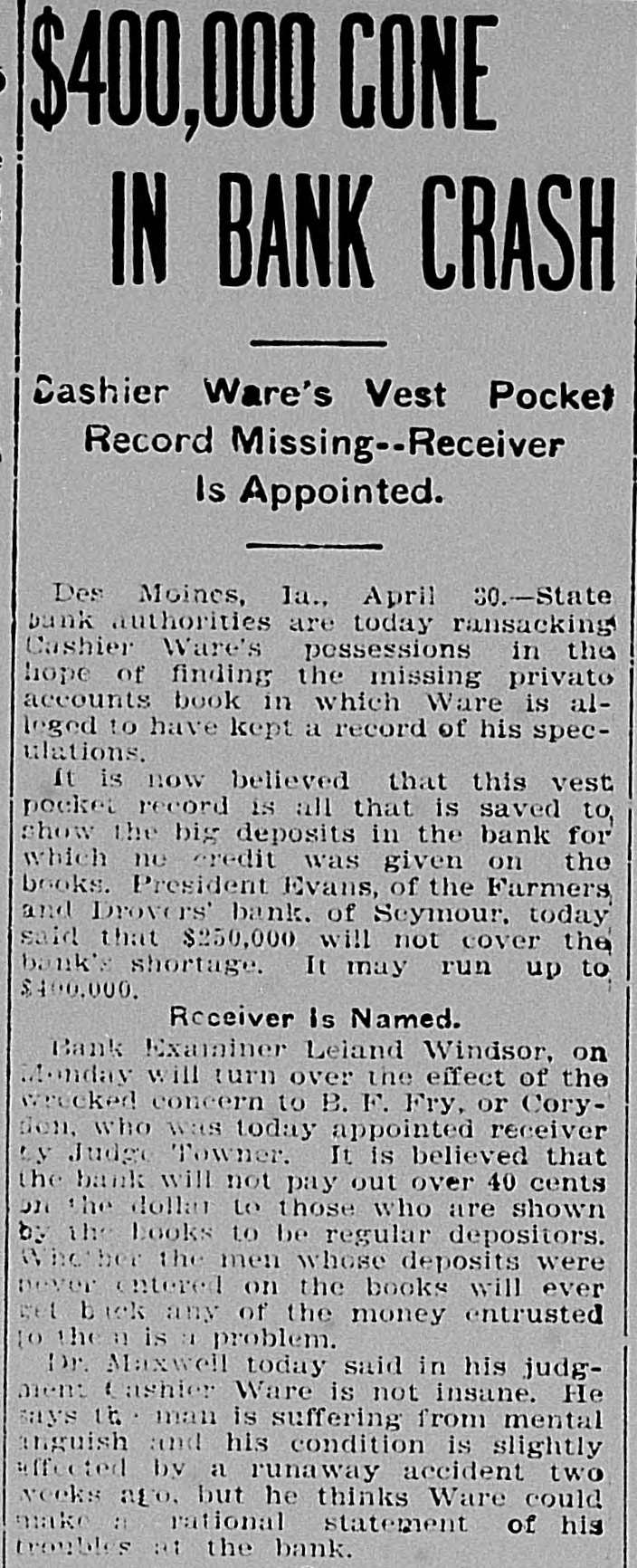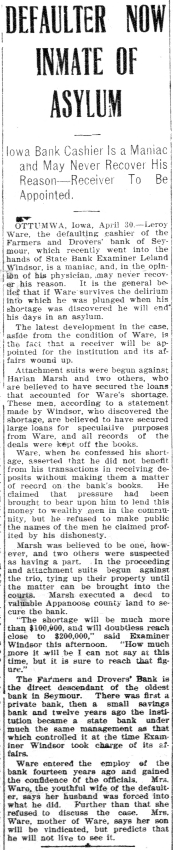 DEFAULTER NOW INMATE OF ASYLUM lowa Bank Cashier Is a Maniac and May Never Recover His Reason-Receiver To Be Appointed. OTTUMWA, Iowa, April 30.-Leroy Ware, the defaulting cashier of the Farmers and Drovers' bank of Seymour, which recently went into the hands of State Bank Examiner Leland Windsor, is a maniac, and, in the opinion of his physician, may never recover his reason. It is the general belief that if Ware survives the delirium into which he was plunged when his shortage was discovered he will end* his days in an asylum. The latest development in the case, asfde from the condition of Ware, is the fact that a receiver will be appointed for the institution and its affairs wound up. Attachment suits were begun against Harlan Marsh and two others, who are believed to have secured the loans that accounted for Ware's shortage. These men, according to a statement made by Windsor, who discovered the shortage, are believed to have secured large loans for speculative purposes from Ware, and all records of the deals were kept off the books. Ware, when he confessed his shortage, asserted that he did not benefit from his transactions in receiving deposits without making them a matter of record on the bank's books. He claimed that pressure had been brought to bear upon him to lend this money to wealthy men in the community, but he refused to make public the names of the men he claimed profited by his dishonesty. Marsh was believed to be one, however, and two others were suspected as having a part. In the proceeding and attachment suits begun against the trio, tying up their property until the matter can be brought into the courts. Marsh executed a deed to valuable Appanoose county land to secure the bank. "The shortage will be much more than $100,000, and will doubtless reach close to $200,000," said Examiner Windsor this afternoon. "How much more it will be I can not say at this time, but it is sure to reach that figure." The Farmers and Drovers' Bank is the direct descendant of the oldest bank in Seymour. There was first a private bank, then a small savings bank and twelve years ago the institution became a state bank under much the same management as that which controlled it at the time ExamIner Windsor took charge of its atfairs. Ware entered the employ of the bank fourteen years ago and gained the confidence of the officials. Mrs. Ware, the youthful wife of the defaulter, says her husband was forced into what he did. Further than that she refused to discuss the case. Mrs. Ware, mother of Ware, says her son will be vindicated, but predicts that he will not live to see it.