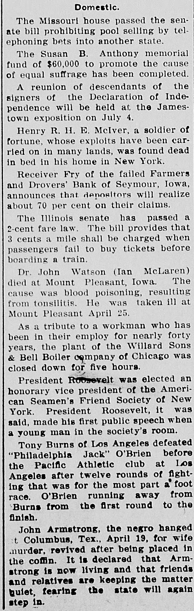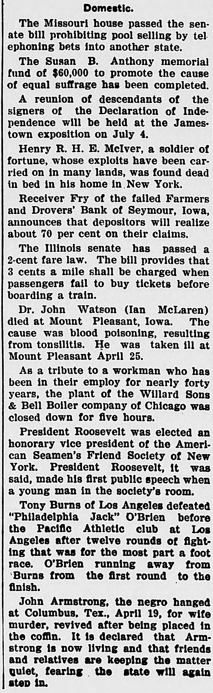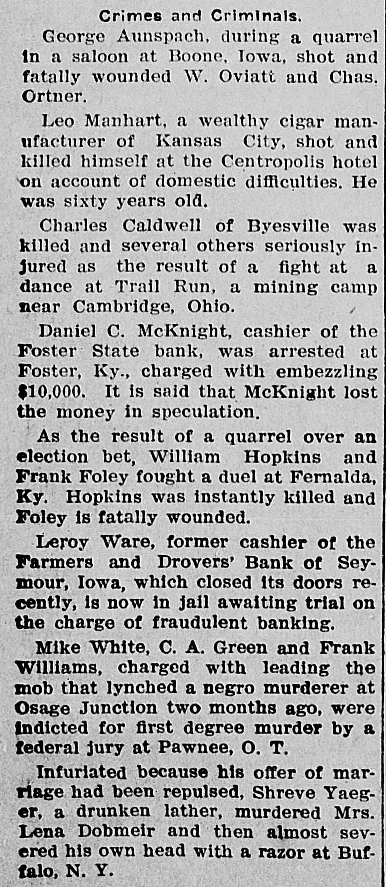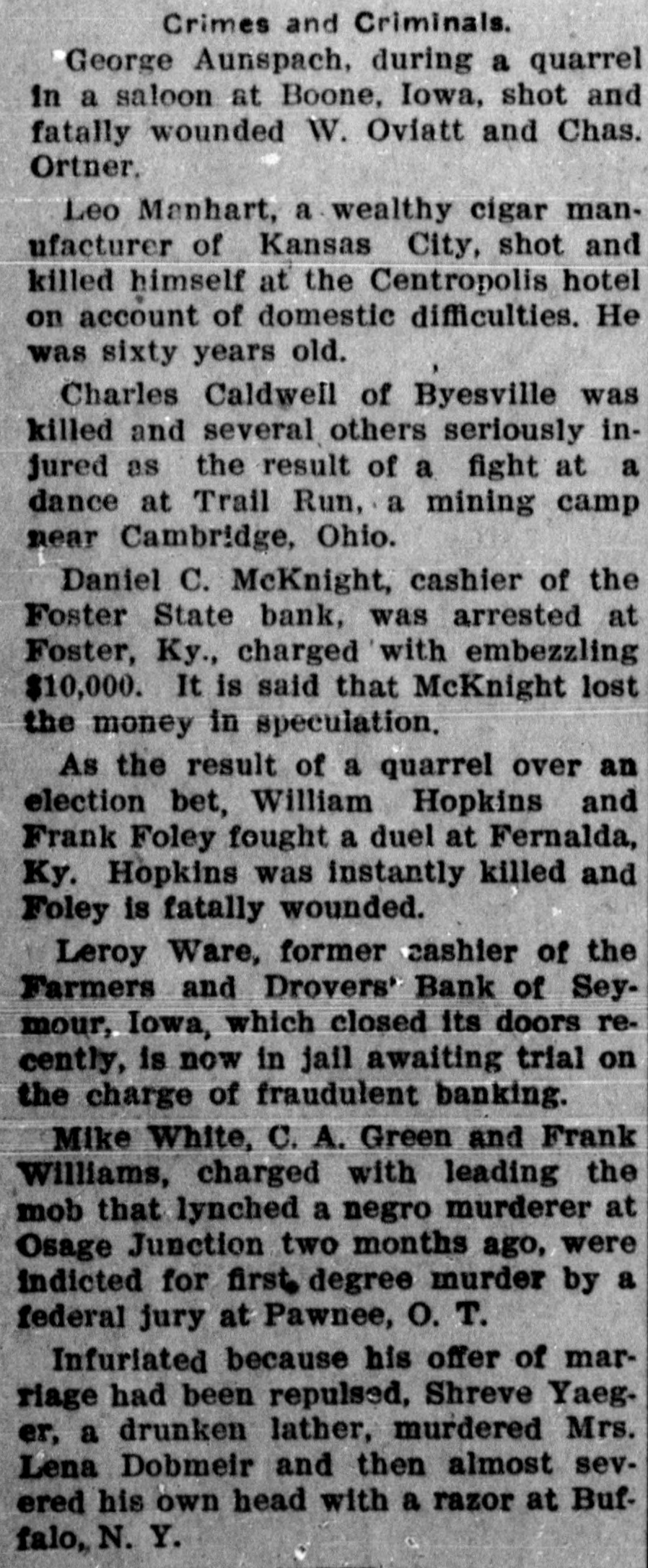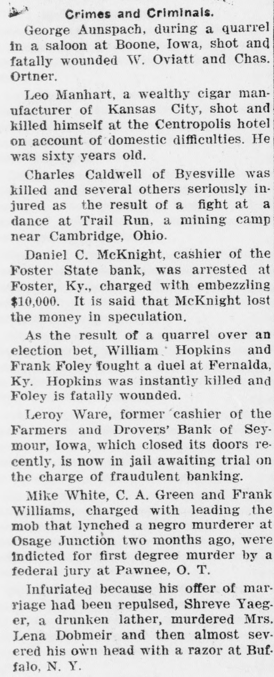 DEFAULTER NOW INMATE OF ASYLUM lowa Bank Cashier Is a Maniac and May Never Recover His Reason-Receiver To Be Appointed. OTTUMWA, Iowa, April 30.-Leroy Ware, the defaulting cashier of the Farmers and Drovers' bank of Seymour, which recently went into the hands of State Bank Examiner Leland Windsor, is a maniac, and, in the opinion of his physician, may never recover his reason. It is the general belief that if Ware survives the delirium into which he was plunged when his shortage was discovered he will end* his days in an asylum. The latest development in the case, asfde from the condition of Ware, is the fact that a receiver will be appointed for the institution and its affairs wound up. Attachment suits were begun against Harlan Marsh and two others, who are believed to have secured the loans that accounted for Ware's shortage. These men, according to a statement made by Windsor, who discovered the shortage, are believed to have secured large loans for speculative purposes from Ware, and all records of the deals were kept off the books. Ware, when he confessed his shortage, asserted that he did not benefit from his transactions in receiving deposits without making them a matter of record on the bank's books. He claimed that pressure had been brought to bear upon him to lend this money to wealthy men in the community, but he refused to make public the names of the men he claimed profited by his dishonesty. Marsh was believed to be one, however, and two others were suspected as having a part. In the proceeding and attachment suits begun against the trio, tying up their property until the matter can be brought into the courts. Marsh executed a deed to valuable Appanoose county land to secure the bank. "The shortage will be much more than $100,000, and will doubtless reach close to $200,000," said Examiner Windsor this afternoon. "How much more it will be I can not say at this time, but it is sure to reach that figure." The Farmers and Drovers' Bank is the direct descendant of the oldest bank in Seymour. There was first a private bank, then a small savings bank and twelve years ago the institution became a state bank under much the same management as that which controlled it at the time ExamIner Windsor took charge of its atfairs. Ware entered the employ of the bank fourteen years ago and gained the confidence of the officials. Mrs. Ware, the youthful wife of the defaulter, says her husband was forced into what he did. Further than that she refused to discuss the case. Mrs. Ware, mother of Ware, says her son will be vindicated, but predicts that he will not live to see it.