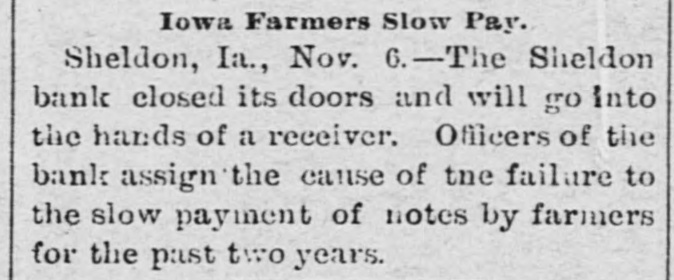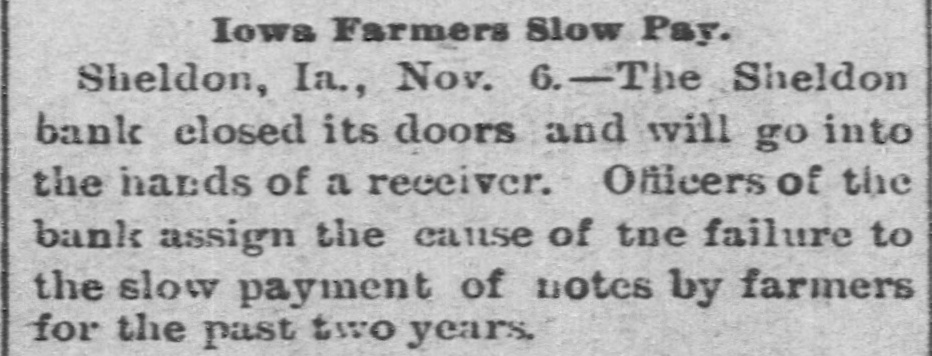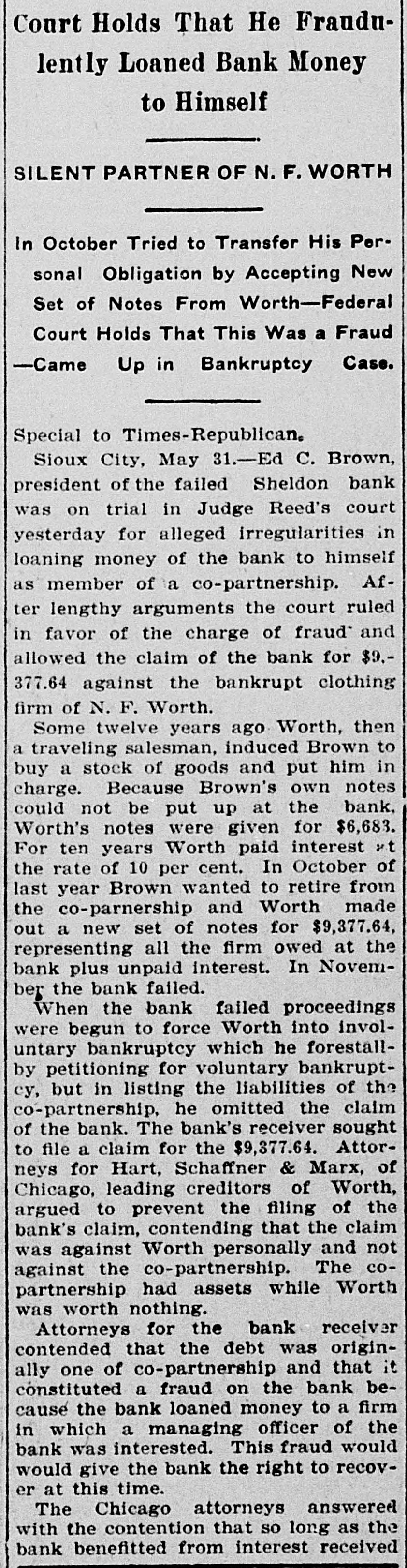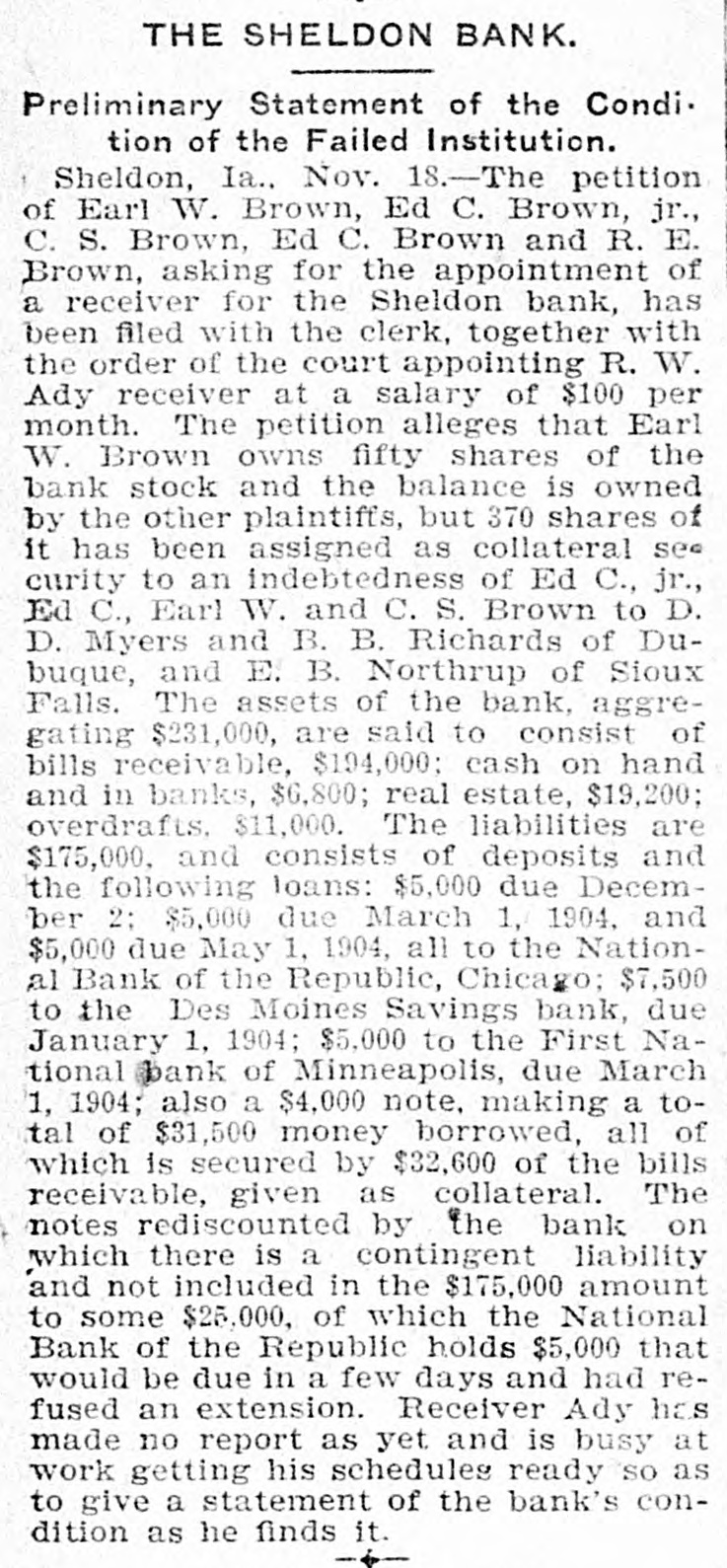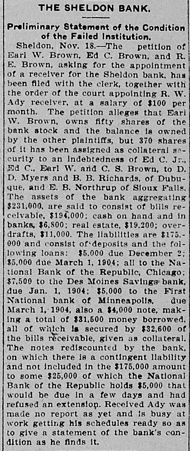THE SHELDON BANK. Preliminary Statement of the Condition of the Failed Institution. Sheldon, Ia., Nov. 18.-The petition of Earl W. Brown, Ed C. Brown, jr., C. S. Brown, Ed C. Brown and R. E. Brown, asking for the appointment of a receiver for the Sheldon bank, has been filed with the clerk, together with the order of the court appointing R. W. Ady receiver at a salary of $100 per month. The petition alleges that Earl W. Brown owns fifty shares of the bank stock and the balance is owned by the other plaintiffs, but 370 shares of it has been assigned as collateral see curity to an indebtedness of Ed C., jr., Ed C., Earl W. and C. S. Brown to D. D. Myers and B. B. Richards of Dubuque, and E. B. Northrup of Sioux Falls. The assets of the bank, aggregating $231,000, are said to consist of bills receivable, $194,000; cash on hand and in banks, $6,800; real estate, $19,200; overdrafts. $11,000. The liabilities are $175,000, and consists of deposits and the following loans: $5,000 due December 2; $5,000 due March 1, 1904, and $5,000 due May 1, 1904, all to the National Bank of the Republic, Chicago; $7,500 to the Des Moines Savings bank, due January 1, 1904; $5,000 to the First National bank of Minneapolis, due March 1, 1904; also a $4,000 note, making a total of $31,500 money borrowed, all of which is secured by $32,600 of the bills receivable, given as collateral. The notes rediscounted by the bank on which there is a contingent liability and not included in the $175,000 amount to some $25,000, of which the National Bank of the Republic holds $5,000 that would be due in a few days and had refused an extension. Receiver Ady has made no report as yet and is busy at work getting his schedules ready so as to give a statement of the bank's condition as he finds it.