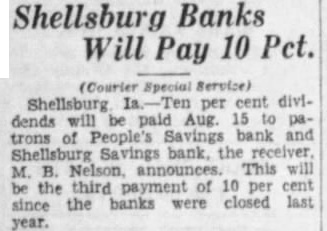 Shellsburg Banks Will Pay 10 Pct. (Courier Special Service) Shellsburg per cent dividends will be paid Aug 15 to patrons of People's Savings bank and Shellsburg Savings bank, the receiver M. B. Nelson. announces. This be the third payment of 10 per since the banks were closed last year.