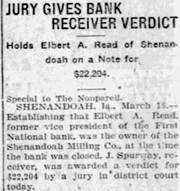 JURY GIVES BANK RECEIVER VERDICT Holds Elbert Read of doah Note for $22,204. Special March that Elbert Read. former president National bank. Shenandoah Milling the bank closed. ceiver, $22,204 jury district court today.