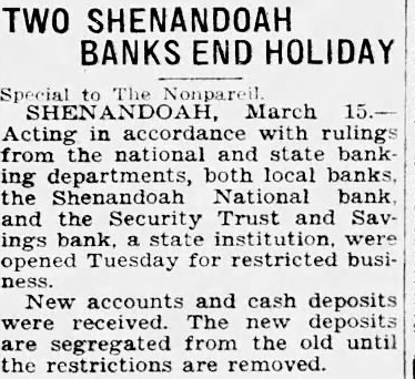 TWO SHENANDOAH BANKS END HOLIDAY Special SHENANDOAH March 15.Acting in accordance with rulings from national and state bank ing departments, both local banks, the Shenandoah National bank and the Security Trust and Savings bank. state institution. were opened Tuesday for restricted business. New accounts and cash deposits were received. The new deposits are segregated from the old until the restrictions are removed.