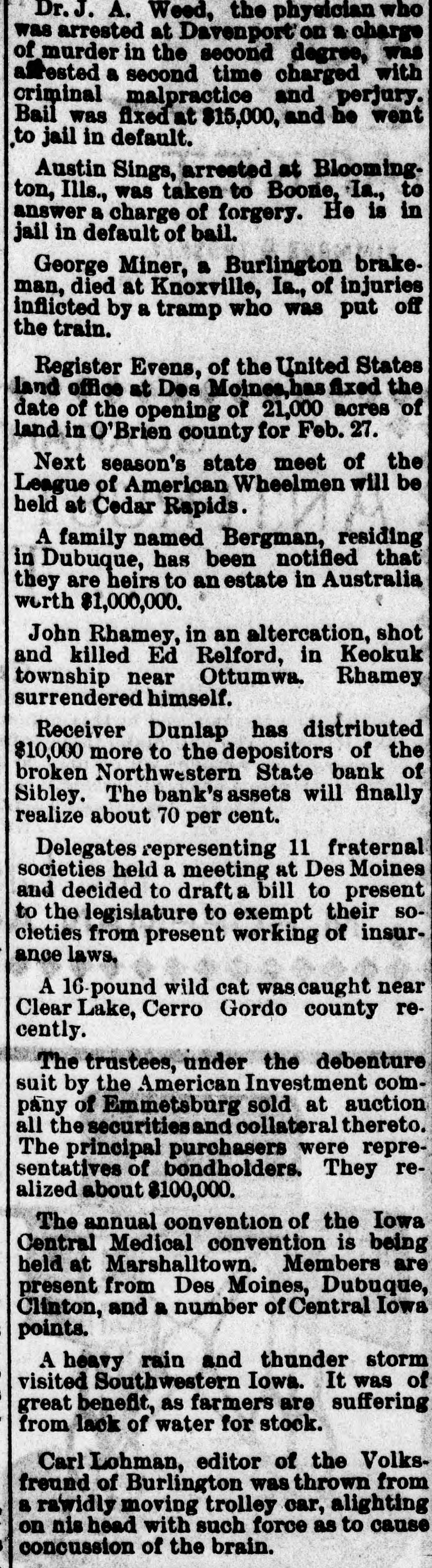 Dr. J. A. Weed, the physician who was arrested at Davenport on a charge of murder in the second degree, was airested a second time charged with criminal malpractice and perjury. Bail was fixed at $15,000, and he went to jail in default. Austin Sings, arrested at Blooming. ton, Ills., was taken to Boone, Ia., to answer a charge of forgery. He is in jail in default of bail. George Miner, a Burlington brakeman, died at Knoxville, Ia., of injuries inflicted by a tramp who was put off the train. Register Evens, of the United States land office at Des Moinea,has fixed the date of the opening of 21,000 acres of land in O'Brien county for Feb. 27. Next season's state meet of the League of American Wheelmen will be held at Cedar Rapids. A family named Bergman, residing in Dubuque, has been notified that they are heirs to an estate in Australia worth $1,000,000. John Rhamey, in an altercation, shot and killed Ed Relford, in Keokuk township near Ottumwa. Rhamey surrendered himself. Receiver Dunlap has distributed $10,000 more to the depositors of the broken Northwestern State bank of Sibley. The bank's assets will finally realize about 70 per cent. Delegates representing 11 fraternal societies held a meeting at Des Moines and decided to draft a bill to present to the legislature to exempt their socleties from present working of insurance laws. A 16-pound wild cat wascaught near Clear Lake, Cerro Gordo county recently. The trustees, under the debenture suit by the American Investment company of Emmetsburg sold at auction all the securities and collateral thereto. The principal purchasers were representatives of bondholders. They realized about $100,000. The annual convention of the Iowa Central Medical convention is being held at Marshalltown. Members are present from Des Moines, Dubuque, Clinton, and a number of Central Iowa points. A heavy rain and thunder storm visited Southwestern Iowa. It was of great benefit, as farmers are suffering from lack of water for stock. Carl Lohman, editor of the Volksfreund of Burlington was thrown from a rawidly moving trolley car, alighting on nis head with such force as to cause concussion of the brain.