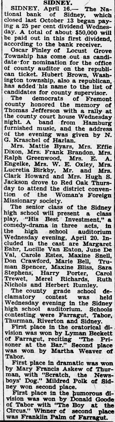 SIDNEY. SIDNEY. April 16.- The National bank of Sidney, which closed last October 13 began paying a 25 per cent dividend Wednesday. A total of about $50,000 will be paid out in this first dividend, according to the bank receiver. Oscar Finley of Locust Grove Township has come out as candidate for nomination for the office of county auditor on the republican ticket. Hubert Brown, Washington township, also a republican, has added his name to the list of candidates for county supervisor. The democrats of Fremont county honored the memory of Thomas Jefferson with a rally at the county court house Wednesday night. A band from Hamburg furnished music, and the address of the evening was given by N. G. Kraschel of Harlan. Mrs. Mattie Byars, Mrs. Effie Dixon, Mrs. Frank Brandon, Mrs. Ralph Greenwood, Mrs. E. A. Engelke, Mrs. W. E. Oxley, Mrs. Lucretia Birkby, Mr. and Mrs. Clark Howard and Mrs. Hugh S. Jackson drove to Red Oak Thursday to attend the district convention of the Woman's Foreign Missionary society. The senior class of the Sidney high school will present a class play, "His Best Investment." a comedy-drama in three acts, in the high school auditorium Wednesday evening, April 20. Included in the cast are Margaret Bahr, Lucille Van Eaton, June De Val, Carole Estes, Maxine Snell, Don Crawford, Marie Bell, Truman Spencer, Maxine Bliss, Sara Stephens, Harry Porter, Carol Trewet, Merel Richards, Ruth Nichols and Herbert Rumley. The county grade school declamatory contest was held Wednesday evening in the Sidney high school auditorium. Schools contesting were Farragut, Tabor, Thurman, Riverton and Sidney. First place in the oratorical division was won by Lyman Beckett of Farragut, reciting "The Prisoner at the Bar." Second place was won by Martha Weaver of Tabor. First place in dramatic was won by Mary Francis Askew of Thurman, with "Scratch, the Newsboys' Dog." Mildred Polk of Sidney won second place. First place in the humorous division was won by Donald Goode of Tabor with "The Boy at the Circus." Winner of second place was Franklin Palm of Farragut.