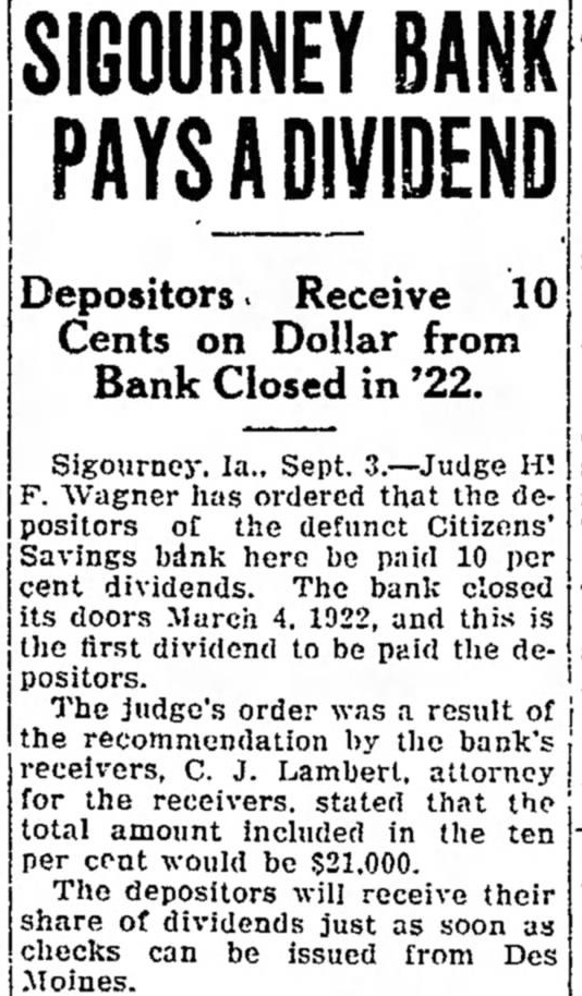 SIGOURNEY BANK Depositors Receive 10 Cents on Dollar from Bank Closed in '22. Wagner has ordered that the depositors the defunct Citizens' Savings bank here be paid 10 per cent dividends. The bank closed its doors March 1922, and this is the first dividend to be paid the depositors. The judge's order was result of the by the bank's receivers, C. Lambert. attorney for the stated that the total amount included in the ten per cent would be $21,000. The depositors will receive their share of dividends just as soon as checks can be issued from Des Moines.