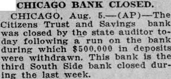 RUN ON CHICAGO BANK ENDS AS BANK CLOSES Chicago, Aug. 5, Citizens Trust and Savings bank was closed by the state auditor today following run on the bank during which $500,000 in deposits were withdrawn. This bank is the third south side bank closed during the last week.