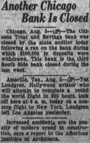 Chicago, Aug. 5. Citizens Trust & Savings bank was closed by the state auditor today during a run on the bank, during which $500,000 in deposits were withdrawn. This bank is the third south side bank closed during the last week. The Citizens bank is located at the edge of the negro district. The first bank to close was the Binga State, with deposits of more than $1,200,000 among the negroes. The second was the Roosevelt State, which also had deposits of more than $1,000,000, much of it negro savings. The Roosevelt State was closed. due to a cash shortage caused by withdrawals after the Binga bank was closed. The Citizens bank was capitalized at $200,000 and had deposits of about $1,000,050.