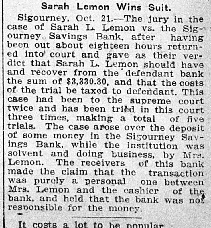 Sarah Lemon Wins Suit. Sigourney, Oct. 21.-The jury in the case of Sarah L Lemon vs. the Sigourney Savings Bank. after having been out about eighteen hours returned into court and gave as their verdict that Sarah L. Lemon should have and recover from the defendant bank the sum of $3,330.30, and that the costs of the trial be taxed to defendant. This case had been to the supreme court twice and has been tried in this court three times, making a total of five trials. The case arose over the deposit of some money in the Sigourney Savings Bank, while the institution was solvent and doing business, by Mrs. Lemon. The receivers of this bank made the claim that the transaction was purely a personal one between Mrs. Lemon and the cashier of the bank, and held that the bank was nov responsible for the money. It costs a lot to be ponular