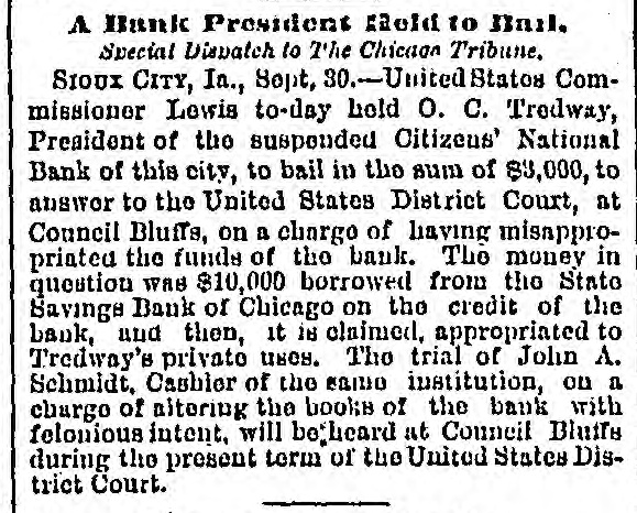 A Bank President fRold to Bail. Special Dispatch to The Chicagon Tribune, Stoux CITY, Ia., Sept, 30.-United States Commissioner Lewis to-day hold O. C. Tredway, President of the suspended Citizens' National Bank of this city, to bail in the sum of $3,000, to answer to the United States District Court, at Council Bluffs, on a charge of liaving misapproprinted the funds of the bank. The money in question was $10,000 borrowed from the State Savings Bank of Chicago on the credit of the bank, and then, it is claimed, appropriated to Tredway's private uses. The trial of John A. Schmidt, Cashier of the same institution, on a charge of altering the books of the bank with felonious intent, will betheard at Conneil Bluffs during the present term of the United States District Court.