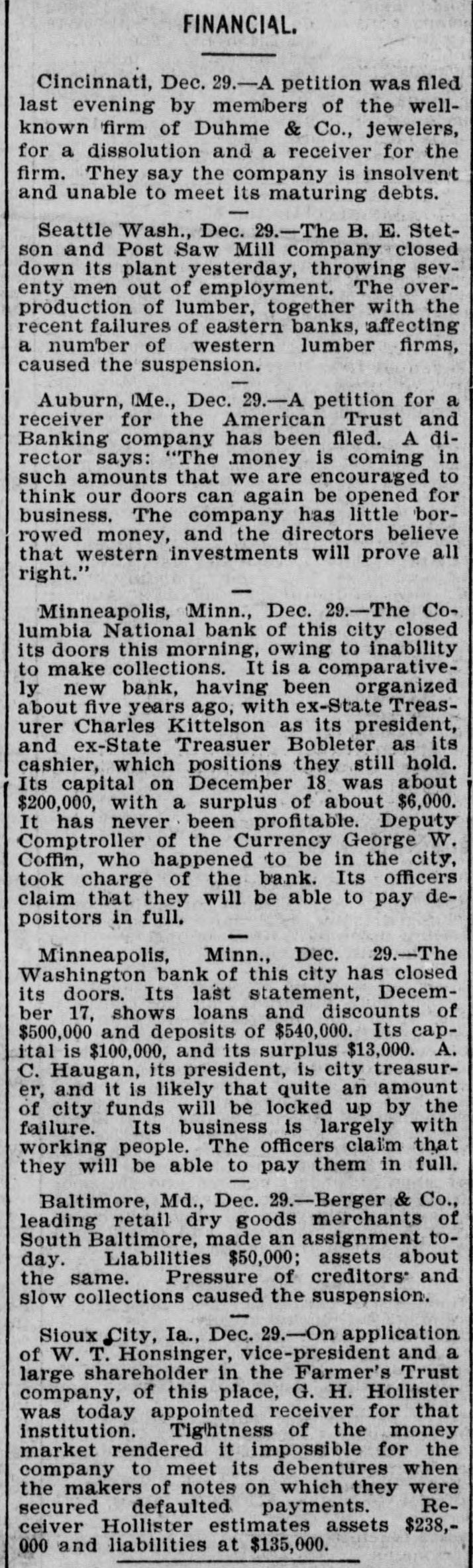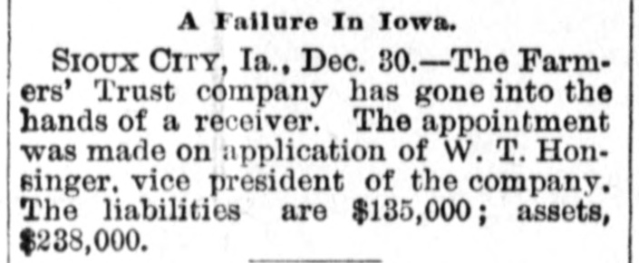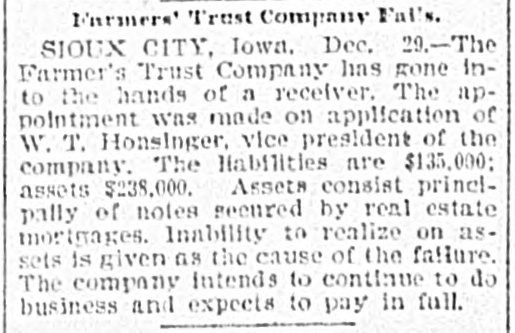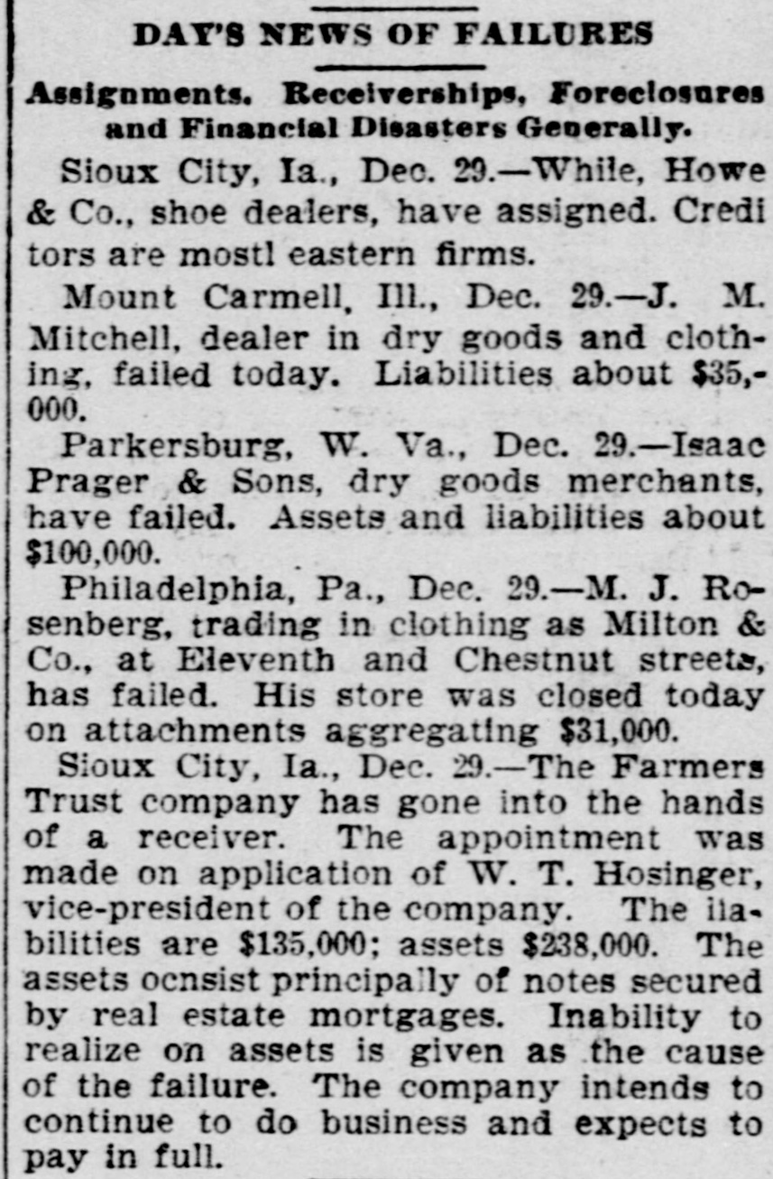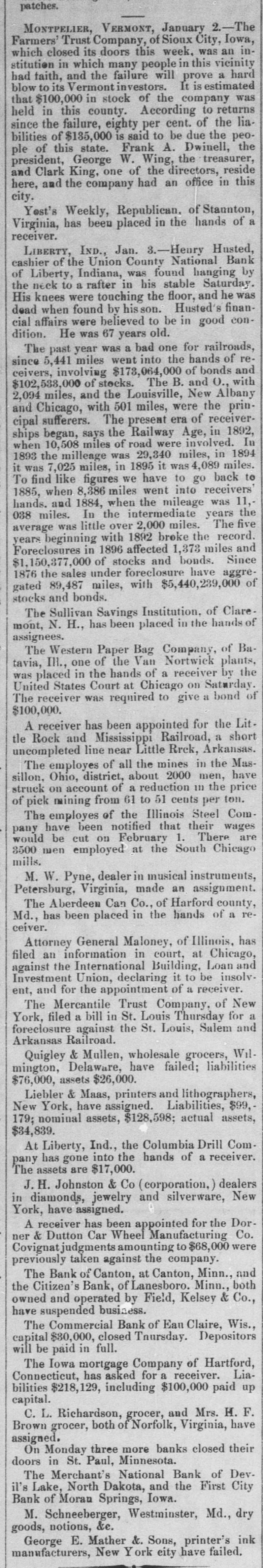 patches. MONTPELIER, VERMONT, January 2.-The Farmers' Trust Company, of Sioux City, Iowa, which closed its doors this week, was an institution in which many people in this vicinity had faith, and the failure will prove a hard blow to its Vermont investors. It is estimated that $100,000 in stock of the company was held in this county. According to returns since the failure, eighty per cent. of the liabilities of $135,000 is said to be due the people of this state. Frank A. Dwinell, the president, George W. Wing, the treasurer, and Clark King, one of the directors, reside here, and the company had an office in this city. Yest's Weekly, Republican, of Staunton, Virginia, has been placed in the hands of a receiver. LIBERTY, IND., Jan. 3.-Henry Husted, cashier of the Union County National Bank of Liberty, Indiana, was found hanging by the neck to a rafter in his stable Saturday. His knees were touching the floor, and he was dead when found by his Husted's financial affairs were believed to be in good condition. He was 67 years old. The past year was a bad one for railroads, since 5,441 miles went into the hands of receivers, involving $178,064,000 of bonds and $102,538,000 of stocks. The B. and O., with 2,094 miles, and the Louisville, New Albany and Chicago, with 501 miles, were the principal sufferers. The present era of receiverships began, says the Railway Age, in 1892, when 10,508 miles of road were involved. In 1893 the milleage was 29,340 miles, in 1894 it was 7,025 miles, in 1895 it was 4,089 miles. To find like figures we have to go back to 1885, when 8,386 miles went into receivers' hands. and 1884, when the mileage was 11,038 miles. In the intermediate years the average was little over 2,000 miles. The five years beginning with 1892 broke the record. Foreclosures in 1896 affected 1,373 miles and $1,150,377,000 of stocks and bonds. Since 1876 the sales under foreclosure have aggregated 89,487 miles, with $5,440,239,000 of stocks and bonds. The Sullivan Savings Institution. of Claremont, N. H., has been placed in the hands of assignees. The Western Paper Bag Company, of Batavia, III., one of the Van Nortwick plants, was placed in the hands of a receiver by the United States Court at Chicago on Saturday. The receiver was required to give a bond of $100,000. A receiver has been appointed for the Little Rock and Mississippi Railroad, a short uncompleted line near Little Rrck, Arkansas. The employes of all the mines in the Massillon, Ohio, district, about 2000 men, have struck on account of a reduction 111 the price of pick mining from 61 to 51 cents per ton. The employes of the Illinois Steel Company have been notified that their wages would be cut on February 1. There are 3500 men employed at the South Chicago mills. M. W. Pyne, dealer in musical instruments, Petersburg, Virginia, made an assignment. The Aberdeen Can Co., of Harford county, Md., has been placed in the hands of a receiver. Attorney General Maloney, of Illinois, has filed an information in court, at Chicago, against the International Building, Loan and Investment Union, declaring it to be insolvent, and for the appointment of a receiver. The Mercantile Trust Company, of New York, filed a bill in St. Louis Thursday for a foreclosure against the St. Louis, Salem and Arkansas Railroad. Quigley & Mullen, wholesale grocers, Wilmington, Delaware, have failed; liabilities $76,000, assets $26,000. Liebler & Maas, printers and lithographers, New York, have assigned. Liabilities, $99, 179; nominal assets, $128,598; actual assets, $34,839. At Liberty, Ind., the Columbia Drill Company has gone into the hands of a receiver. The assets are $17,000. J. H. Johnston & Co (corporation, dealers in diamonds, jewelry and silverware, New York, have assigned. A receiver has been appointed for the Dorner & Dutton Car Wheel Manufacturing Co. Covignat judgments amounting to $68,000 were previously taken against the company. The Bank of Canton, at Canton, Minn., and the Citizen's Bank, of Lanesboro. Minn., both owned and operated by Field, Kelsey & Co., have suspended business. The Commercial Bank of Eau Claire, Wis., capital $30,000, closed Tnursday. Depositors will be paid in full. The Iowa mortgage Company of Hartford, Connecticut, has asked for a receiver. Liabilities $218,129, including $100,000 paid up capital. C. L. Richardson, grocer, and Mrs. H. F. Brown grocer, both of Norfolk, Virginia, have assigned. On Monday three more banks closed their doors in St. Paul, Minnesota. The Merchant's National Bank of Dev. il's Lake, North Dakota, and the First City Bank of Moran Springs, Iowa. M. Schneeberger, Westminster, Md., dry goods, notions, &c. George E. Mather &. Sons, printer's ink manufacturers, New York city have failed.