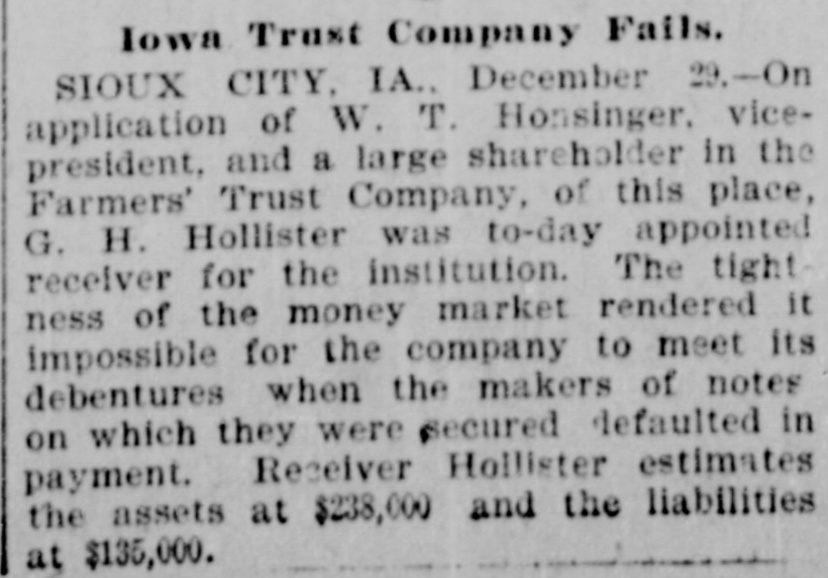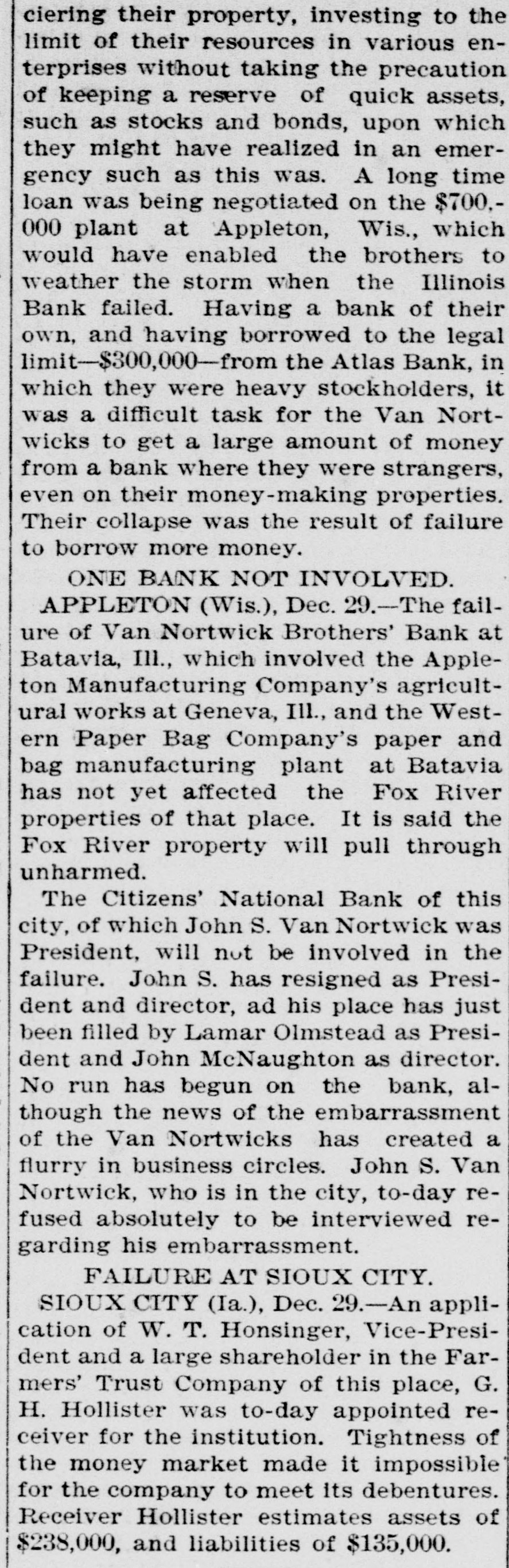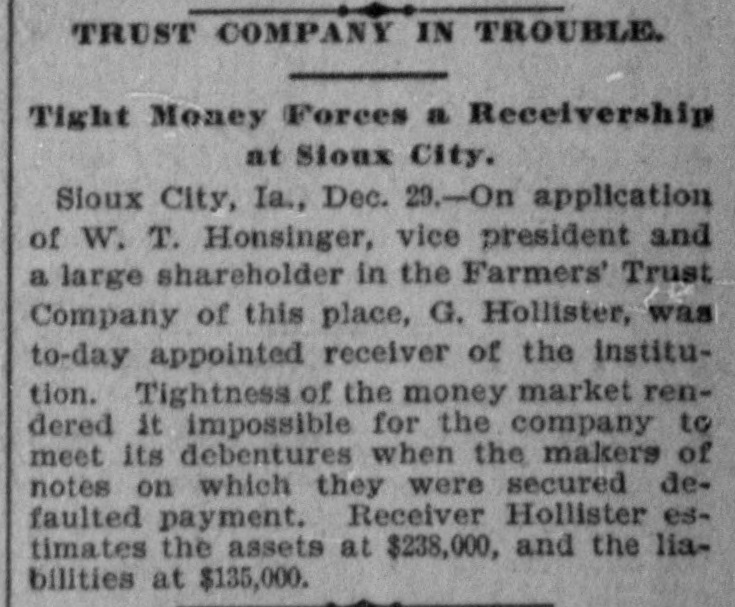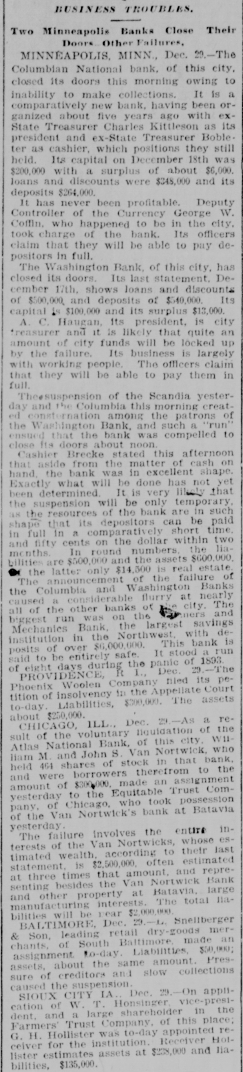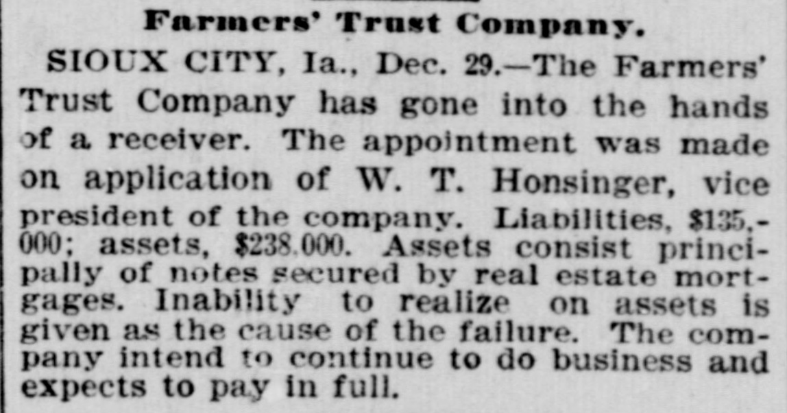 patches. MONTPELIER, VERMONT, January 2.-The Farmers' Trust Company, of Sioux City, Iowa, which closed its doors this week, was an institution in which many people in this vicinity had faith, and the failure will prove a hard blow to its Vermont investors. It is estimated that $100,000 in stock of the company was held in this county. According to returns since the failure, eighty per cent. of the liabilities of $135,000 is said to be due the people of this state. Frank A. Dwinell, the president, George W. Wing, the treasurer, and Clark King, one of the directors, reside here, and the company had an office in this city. Yest's Weekly, Republican, of Staunton, Virginia, has been placed in the hands of a receiver. LIBERTY, IND., Jan. 3.-Henry Husted, cashier of the Union County National Bank of Liberty, Indiana, was found hanging by the neck to a rafter in his stable Saturday. His knees were touching the floor, and he was dead when found by his Husted's financial affairs were believed to be in good condition. He was 67 years old. The past year was a bad one for railroads, since 5,441 miles went into the hands of receivers, involving $178,064,000 of bonds and $102,538,000 of stocks. The B. and O., with 2,094 miles, and the Louisville, New Albany and Chicago, with 501 miles, were the principal sufferers. The present era of receiverships began, says the Railway Age, in 1892, when 10,508 miles of road were involved. In 1893 the milleage was 29,340 miles, in 1894 it was 7,025 miles, in 1895 it was 4,089 miles. To find like figures we have to go back to 1885, when 8,386 miles went into receivers' hands. and 1884, when the mileage was 11,038 miles. In the intermediate years the average was little over 2,000 miles. The five years beginning with 1892 broke the record. Foreclosures in 1896 affected 1,373 miles and $1,150,377,000 of stocks and bonds. Since 1876 the sales under foreclosure have aggregated 89,487 miles, with $5,440,239,000 of stocks and bonds. The Sullivan Savings Institution. of Claremont, N. H., has been placed in the hands of assignees. The Western Paper Bag Company, of Batavia, III., one of the Van Nortwick plants, was placed in the hands of a receiver by the United States Court at Chicago on Saturday. The receiver was required to give a bond of $100,000. A receiver has been appointed for the Little Rock and Mississippi Railroad, a short uncompleted line near Little Rrck, Arkansas. The employes of all the mines in the Massillon, Ohio, district, about 2000 men, have struck on account of a reduction 111 the price of pick mining from 61 to 51 cents per ton. The employes of the Illinois Steel Company have been notified that their wages would be cut on February 1. There are 3500 men employed at the South Chicago mills. M. W. Pyne, dealer in musical instruments, Petersburg, Virginia, made an assignment. The Aberdeen Can Co., of Harford county, Md., has been placed in the hands of a receiver. Attorney General Maloney, of Illinois, has filed an information in court, at Chicago, against the International Building, Loan and Investment Union, declaring it to be insolvent, and for the appointment of a receiver. The Mercantile Trust Company, of New York, filed a bill in St. Louis Thursday for a foreclosure against the St. Louis, Salem and Arkansas Railroad. Quigley & Mullen, wholesale grocers, Wilmington, Delaware, have failed; liabilities $76,000, assets $26,000. Liebler & Maas, printers and lithographers, New York, have assigned. Liabilities, $99, 179; nominal assets, $128,598; actual assets, $34,839. At Liberty, Ind., the Columbia Drill Company has gone into the hands of a receiver. The assets are $17,000. J. H. Johnston & Co (corporation, dealers in diamonds, jewelry and silverware, New York, have assigned. A receiver has been appointed for the Dorner & Dutton Car Wheel Manufacturing Co. Covignat judgments amounting to $68,000 were previously taken against the company. The Bank of Canton, at Canton, Minn., and the Citizen's Bank, of Lanesboro. Minn., both owned and operated by Field, Kelsey & Co., have suspended business. The Commercial Bank of Eau Claire, Wis., capital $30,000, closed Tnursday. Depositors will be paid in full. The Iowa mortgage Company of Hartford, Connecticut, has asked for a receiver. Liabilities $218,129, including $100,000 paid up capital. C. L. Richardson, grocer, and Mrs. H. F. Brown grocer, both of Norfolk, Virginia, have assigned. On Monday three more banks closed their doors in St. Paul, Minnesota. The Merchant's National Bank of Dev. il's Lake, North Dakota, and the First City Bank of Moran Springs, Iowa. M. Schneeberger, Westminster, Md., dry goods, notions, &c. George E. Mather &. Sons, printer's ink manufacturers, New York city have failed.