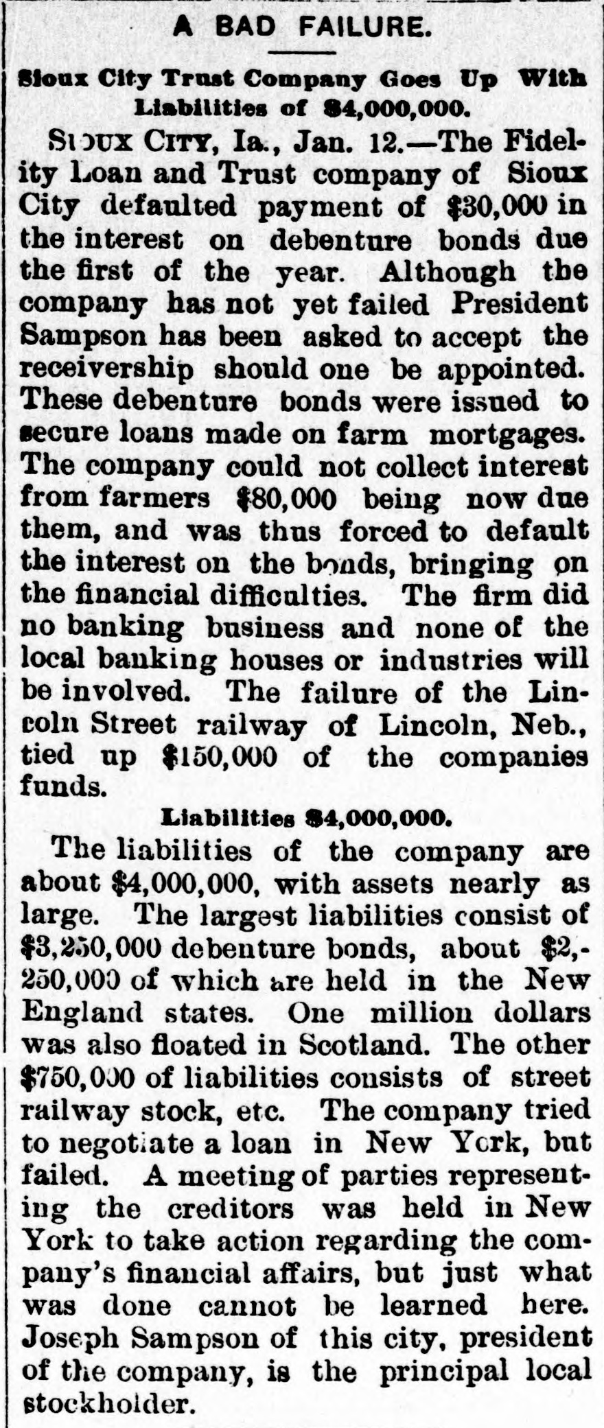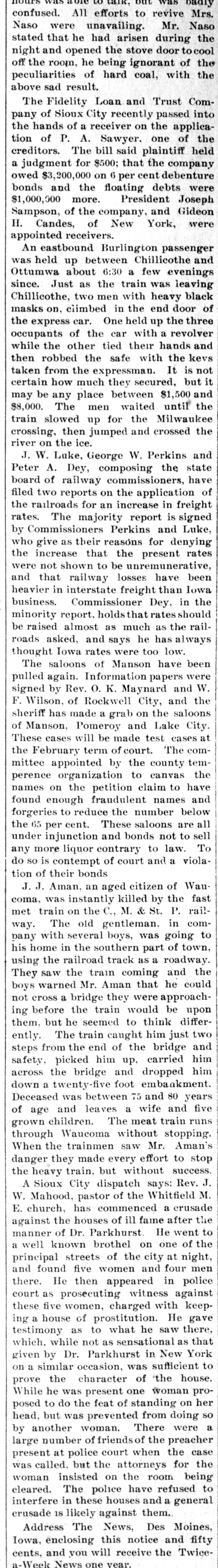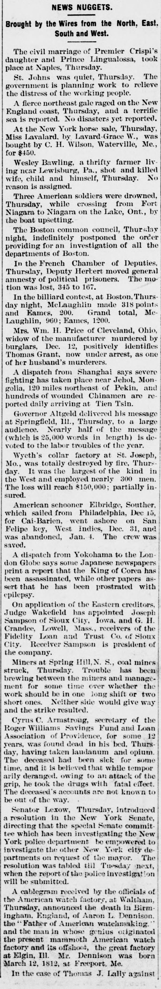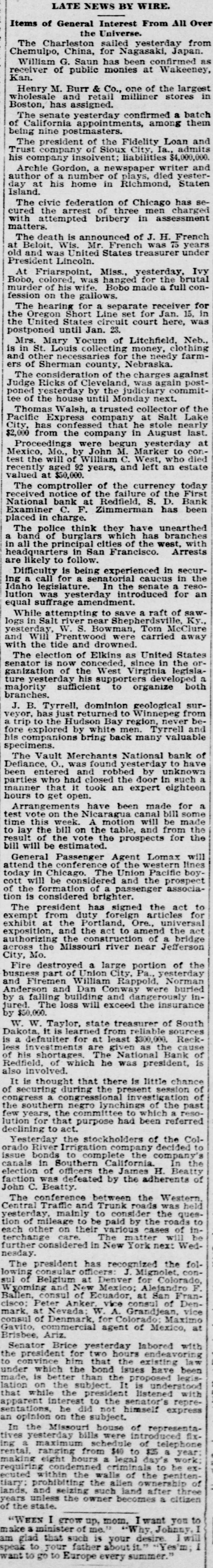 WIRE AH SMIN LATE Items of General Interest From All Over the Universe. The Charleston sailed vesterday from Chemulpo, China, for Nagasaki, Japan. William G. Saun has been confirmed as receiver of public monies at Wakeeney, Man. Henry M. Burr & Co., one of the largest wholesale and retail milliner stores in Boston, has assigned. The senate yesterday confirmed a batch of California appointments, among them being nine postmasters. The president of the Fidelity Loan and Trust company of Sioux City, Ia., admits his company insolvent; liabilities $4,000,000. Archie Gordon, a newspaper writer and author of a number of plays, died yesterday at his home in Richmond, Staten IS The civic federation of Chicago has secured the arrest of three men charged with attempted bribery in assessment matters. The death is announced of J. H. French at Beloit. Wis. Mr. French was 75 years old and was United States treasurer under President Lincoln. At Friarspoint, Miss., yesterday, Ivy Bobo, colored, was hanged for the brutal murder of his wife. Bobo made a full confession on the gallows. The hearing for a separate receiver for the Oregon Short Line set for Jan. 15, in the United States circuit court here, was 23.3 Jan. Inun peuditised Mrs. Mary Yocum of Litchfield, Neb., is in St. Louis collecting money, clothing and other necessaries for the needy farmers of Sherman county, Nebraska. The consideration of the charges against Judge Ricks of Clev reland, was again postponed yesterday by the judiciary committee of the house until Monday next. Thomas Walsh, a trusted collector of the Pacific Express company at Salt Lake City, has confessed that he stole nearly $2,000 from the company in August last. Proceedings were begun yesterday at Mexico. Mo., by John M. Marker to contest the will of William C. West, who died recently aged 92 years, and left an estate valued at $50,000. The comptroller of the currency today received notice of the failure of the First National bank at Redfield. S. D. Bank Examiner C. F. Zimmerman has been placed in charge. The police think they have unearthed band of burglars which has branches a in all the principal cities of the west, with headquarters in San Francisco. Arrests are likely to follow. Difficulty is being experienced in securing a call for a senatorial caucus in the Idaho legislature. In the senate a resolution was yesterday introduced for an equal suffrage amendment. While attempting to save a raft of sawlogs in Salt river near Shepherdsville, Ky., yesterday, W. S. Bowman, Tom McClure and Will Prentwood were carried away with the tide and drowned. The election of Elkins as United States senator is now conceded, since in the organization of the West Virginia legislature yesterday his supporters developed a majority sufficient to organize both branches. J. B. Tyrrell, dominion geological surveyor, has just returned to Winnepeg from a trip to the Hudson Bay region, never before explored by white men. Tyrrell and his companions bring back many valuable The specimens. Vault Merchants National bank of easy 01 yesterday punoj SEM "O Defander been entered and robbed by unknown parties who had closed the door in such a manner that it took an expert eighteen hours to get open. Arrangements have been made for a test vote on the Nicaragua canal bill some time this week. A motion will be made to lay the bill on the table, and from the our 201 prospects the 010A the JO result estimated eq IIIM 1119 General Passenger Agent Lomax will attend the conference of the western lines today in Chicago. The Union Pacific boycott will be considered and the prospect of the formation of a passenger association is considered brighter. The president has signed the act to exempt from duty foreign articles for exhibit at the Portland, Ore., universal exposition, and the act to amend the act B JO the authorized across the Missouri river near Jefferson ON THE Fire destroyed a large portion of the busness part of Union City, Pa., yesterday and Firemen William Rappold, Norman Anderson and Dan Conway were buried by a falling building and dangerously injured. The loss will exceed the insurance 1000'09$ sq W. W. Taylor. state treasurer of South Dakota, It is learned from reliable sources Reck- 000'008$ [east 10 JOJ defenter e SI less investments are given as the cause of his shortages. The National Bank of SI peesident SEM eq which JO Reddeld also involved. It is thought that there is little chance of securing during the present session of congress a congressional investigation of the southern negro lynchings of the past few years, the committee to which a resolution for that purpose had been referred declining to act. Yesterday the stockholders of the Colorado River Irrigation company decided to issue bonds to complete the company's canals in Southern California. In the election of officers the James H. Beatty faction was defeated by the adherents of 0 ayor Beatty. The conference between the Western, Central Traffic and Trunk roads was held yesterday, mainly to consider the question of mileage to be paid by the roads to each other on their various cases of interchange care. The matter will be further considered in New York next Wednesday. The president has recognized the following consular officers: J. Mignolet, consul of Belgium at Denver for Colorado, A A Medico: M9N pur Sujurios M Ballen, consul of Ecuador, at San Francisco: Peter Anker. vice consul of Den901A 'V M Neveral 18 mark. consul of Denmark, for Colorado: Maximo Gavito, commercial agent of Mexico, at Brisbee, Ariz. Senator Brice yesterday labored with the president for two hours ME[ Supsixe *** that miq contribe 01 beeq easy sens] puoq the Japun made, is better than the proposed legisST 11 em uo that while the president listened with apparent interest to the senator's representations, he did not himself express 700(gns *** no ue 10 esnoq prossing the uI tives yesterday bills were introduced fix. ing a maximum schedule of telephone rental. ranging from $