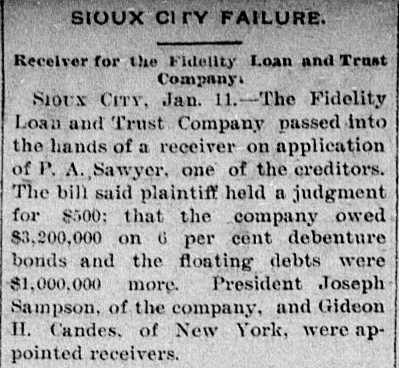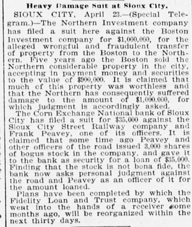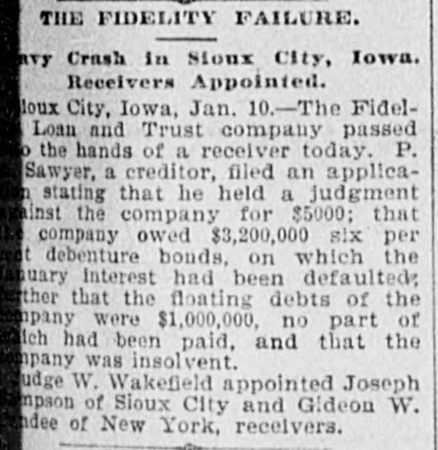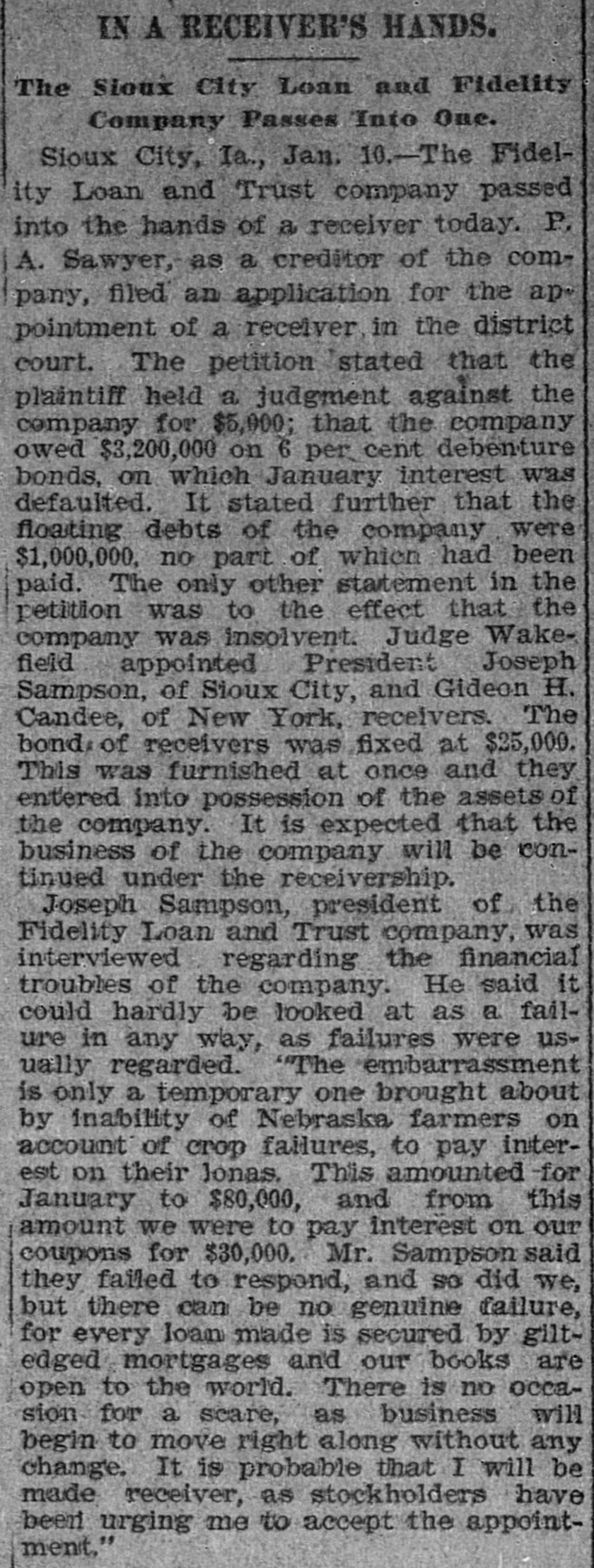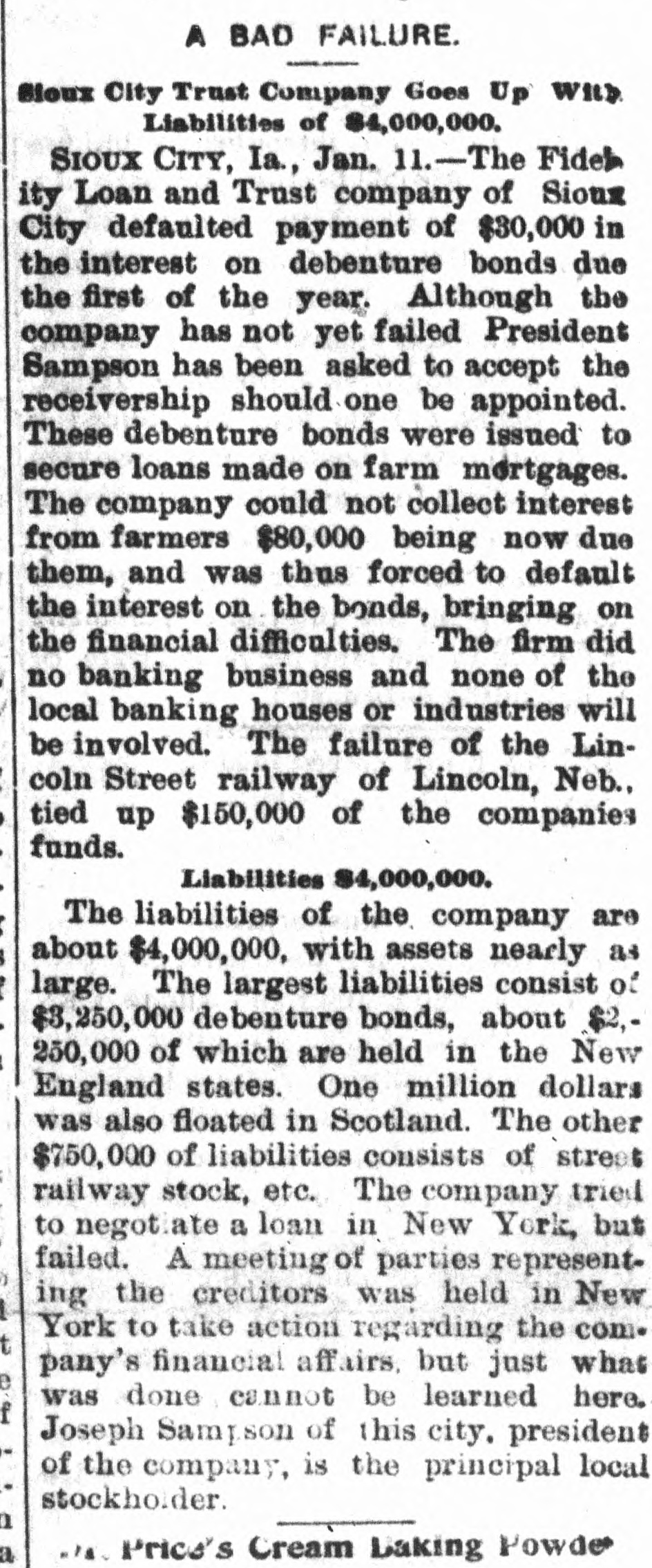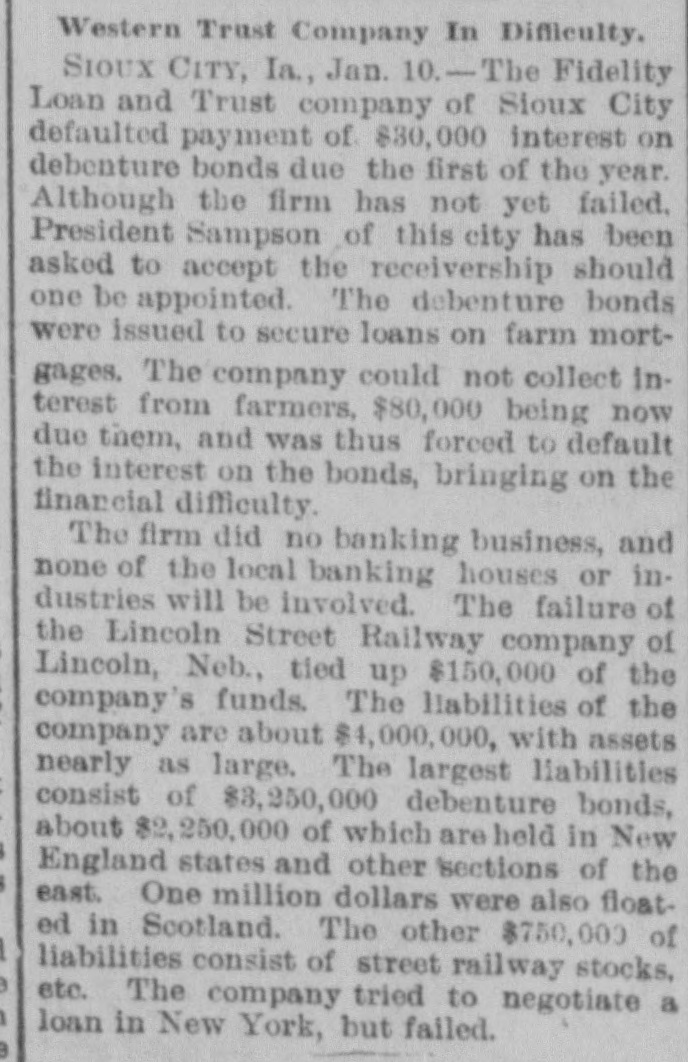 WIRE AH SMIN LATE Items of General Interest From All Over the Universe. The Charleston sailed vesterday from Chemulpo, China, for Nagasaki, Japan. William G. Saun has been confirmed as receiver of public monies at Wakeeney, Man. Henry M. Burr & Co., one of the largest wholesale and retail milliner stores in Boston, has assigned. The senate yesterday confirmed a batch of California appointments, among them being nine postmasters. The president of the Fidelity Loan and Trust company of Sioux City, Ia., admits his company insolvent; liabilities $4,000,000. Archie Gordon, a newspaper writer and author of a number of plays, died yesterday at his home in Richmond, Staten IS The civic federation of Chicago has secured the arrest of three men charged with attempted bribery in assessment matters. The death is announced of J. H. French at Beloit. Wis. Mr. French was 75 years old and was United States treasurer under President Lincoln. At Friarspoint, Miss., yesterday, Ivy Bobo, colored, was hanged for the brutal murder of his wife. Bobo made a full confession on the gallows. The hearing for a separate receiver for the Oregon Short Line set for Jan. 15, in the United States circuit court here, was 23.3 Jan. Inun peuditised Mrs. Mary Yocum of Litchfield, Neb., is in St. Louis collecting money, clothing and other necessaries for the needy farmers of Sherman county, Nebraska. The consideration of the charges against Judge Ricks of Clev reland, was again postponed yesterday by the judiciary committee of the house until Monday next. Thomas Walsh, a trusted collector of the Pacific Express company at Salt Lake City, has confessed that he stole nearly $2,000 from the company in August last. Proceedings were begun yesterday at Mexico. Mo., by John M. Marker to contest the will of William C. West, who died recently aged 92 years, and left an estate valued at $50,000. The comptroller of the currency today received notice of the failure of the First National bank at Redfield. S. D. Bank Examiner C. F. Zimmerman has been placed in charge. The police think they have unearthed band of burglars which has branches a in all the principal cities of the west, with headquarters in San Francisco. Arrests are likely to follow. Difficulty is being experienced in securing a call for a senatorial caucus in the Idaho legislature. In the senate a resolution was yesterday introduced for an equal suffrage amendment. While attempting to save a raft of sawlogs in Salt river near Shepherdsville, Ky., yesterday, W. S. Bowman, Tom McClure and Will Prentwood were carried away with the tide and drowned. The election of Elkins as United States senator is now conceded, since in the organization of the West Virginia legislature yesterday his supporters developed a majority sufficient to organize both branches. J. B. Tyrrell, dominion geological surveyor, has just returned to Winnepeg from a trip to the Hudson Bay region, never before explored by white men. Tyrrell and his companions bring back many valuable The specimens. Vault Merchants National bank of easy 01 yesterday punoj SEM "O Defander been entered and robbed by unknown parties who had closed the door in such a manner that it took an expert eighteen hours to get open. Arrangements have been made for a test vote on the Nicaragua canal bill some time this week. A motion will be made to lay the bill on the table, and from the our 201 prospects the 010A the JO result estimated eq IIIM 1119 General Passenger Agent Lomax will attend the conference of the western lines today in Chicago. The Union Pacific boycott will be considered and the prospect of the formation of a passenger association is considered brighter. The president has signed the act to exempt from duty foreign articles for exhibit at the Portland, Ore., universal exposition, and the act to amend the act B JO the authorized across the Missouri river near Jefferson ON THE Fire destroyed a large portion of the busness part of Union City, Pa., yesterday and Firemen William Rappold, Norman Anderson and Dan Conway were buried by a falling building and dangerously injured. The loss will exceed the insurance 1000'09$ sq W. W. Taylor. state treasurer of South Dakota, It is learned from reliable sources Reck- 000'008$ [east 10 JOJ defenter e SI less investments are given as the cause of his shortages. The National Bank of SI peesident SEM eq which JO Reddeld also involved. It is thought that there is little chance of securing during the present session of congress a congressional investigation of the southern negro lynchings of the past few years, the committee to which a resolution for that purpose had been referred declining to act. Yesterday the stockholders of the Colorado River Irrigation company decided to issue bonds to complete the company's canals in Southern California. In the election of officers the James H. Beatty faction was defeated by the adherents of 0 ayor Beatty. The conference between the Western, Central Traffic and Trunk roads was held yesterday, mainly to consider the question of mileage to be paid by the roads to each other on their various cases of interchange care. The matter will be further considered in New York next Wednesday. The president has recognized the following consular officers: J. Mignolet, consul of Belgium at Denver for Colorado, A A Medico: M9N pur Sujurios M Ballen, consul of Ecuador, at San Francisco: Peter Anker. vice consul of Den901A 'V M Neveral 18 mark. consul of Denmark, for Colorado: Maximo Gavito, commercial agent of Mexico, at Brisbee, Ariz. Senator Brice yesterday labored with the president for two hours ME[ Supsixe *** that miq contribe 01 beeq easy sens] puoq the Japun made, is better than the proposed legisST 11 em uo that while the president listened with apparent interest to the senator's representations, he did not himself express 700(gns *** no ue 10 esnoq prossing the uI tives yesterday bills were introduced fix. ing a maximum schedule of telephone rental. ranging from $